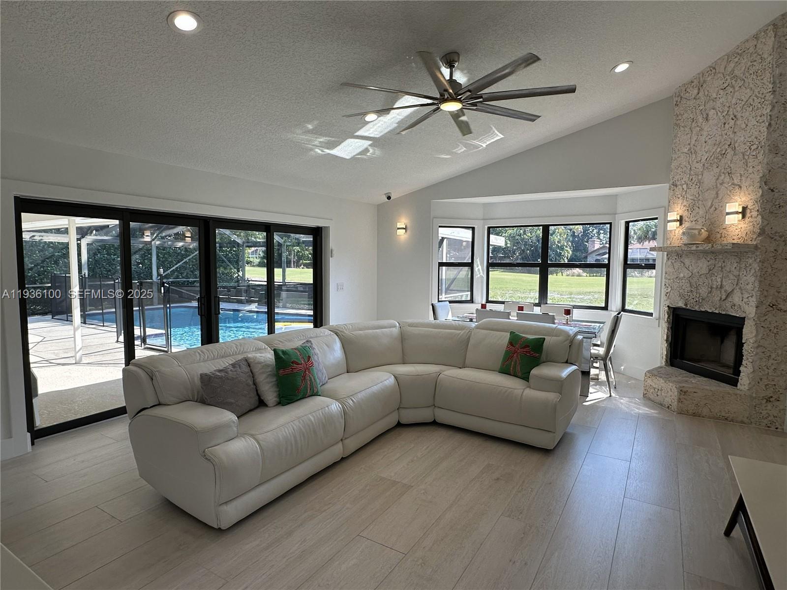 Don't miss this opportunity. This recently renovated 3,113 SF One-Story home with High Ceilings, Golf course view, 4 bedrooms, 3 1/2 baths Is for Sale, Facing the Squire Golf course by the tee box # 14 with Spectacular views of golf course, a lot of natural light, Unique & irreplaceable lot, New Hurricane Windows and doors, brand new chef's kitchen features 2 dishwashers, two sinks (37 1/2" & 20 1/2"), high-end appliances, wall mounted oven & Microwave, wet bar with undercounter refrigerator, wine cooler, sink & Quartz tops. 2 fire places (wood & electrical), Renovated bathrooms, Tile floors, Closet organizers, the pool was resurfaced in 2023, there is a screened patio and child fence for the swimming pool that is removable, no pool heater is present, and the pool water is chlorinated for more details, Please Read the attached list of upgrades and house monthly expenses. This house won't last long on the market. Schedule a private tour or contact the Owner / Listing Agent if you have any questions or would like to see it again privately.