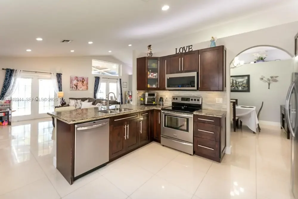 Lakefront luxury awaits in this secluded 3-bedroom, 2-bathroom home in the prestigious Silver Lakes gated community, perfectly positioned on a motorized lake with breathtaking sunset views. Meticulously maintained, it offers an open-concept layout with elegant porcelain floors, custom interior lighting, impact windows, and abundant natural light that creates a bright, airy atmosphere throughout. A whole-home water filtration system plus an additional reverse-osmosis filter in the kitchen provides exceptionally pure drinking water. Step outside to your own waterfront retreat featuring a floating dock with electrical access, ideal for your pontoon or electric boat and peaceful cruises any time of day. The 600+ square-foot enclosed patio showcases panoramic lake views and offers generous space for year-round entertaining, enhanced by landscape lighting that beautifully highlights the palm trees and tropical ambiance. A convenient 2-car garage, walking-distance access to nearby sports and tennis facilities, and a family-friendly setting with excellent area schools complete this resort-style lifestyle, where every day ends with spectacular sunsets over the water. HOA fee includes Cable and Internet (Fiber) service.