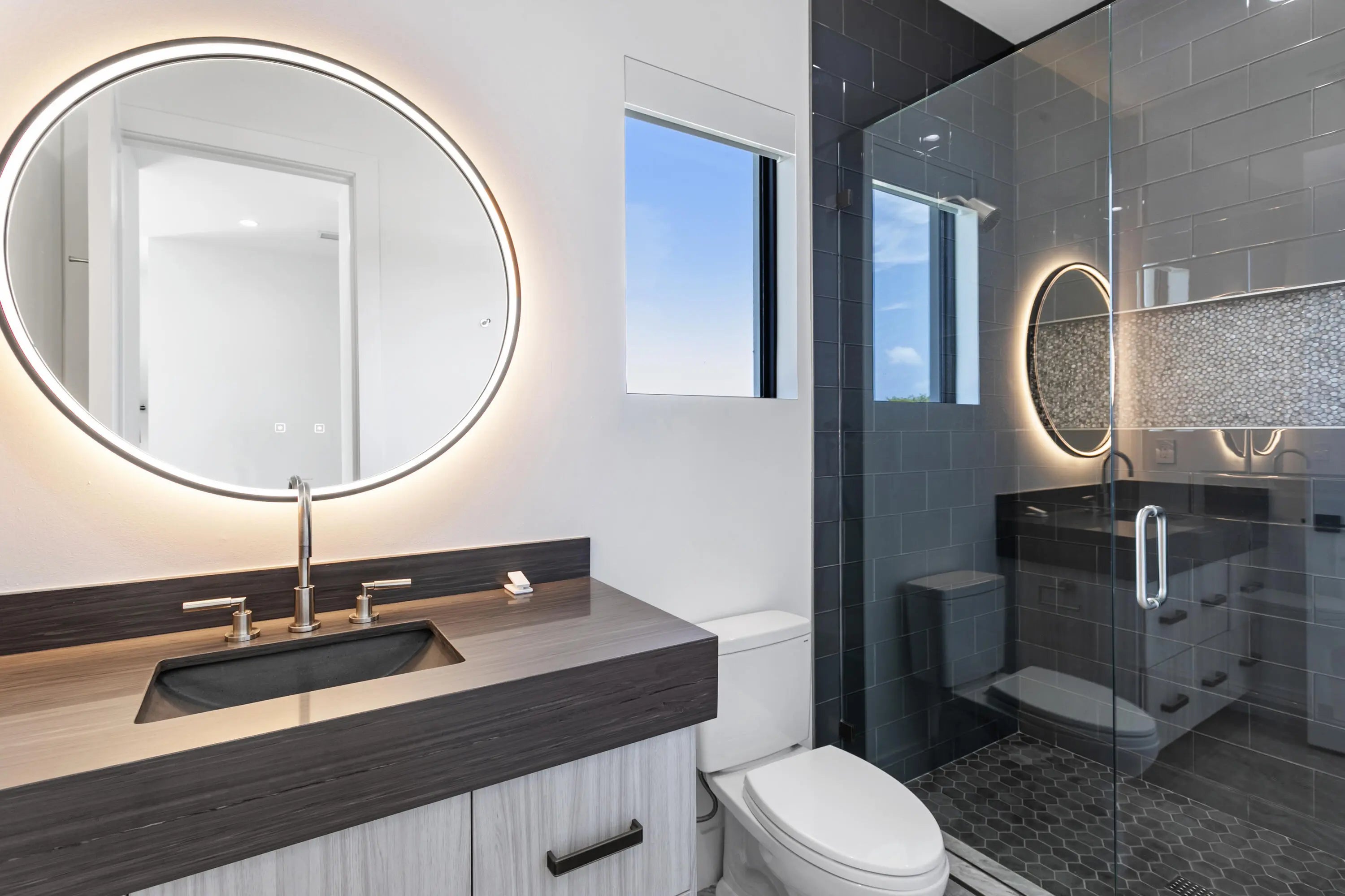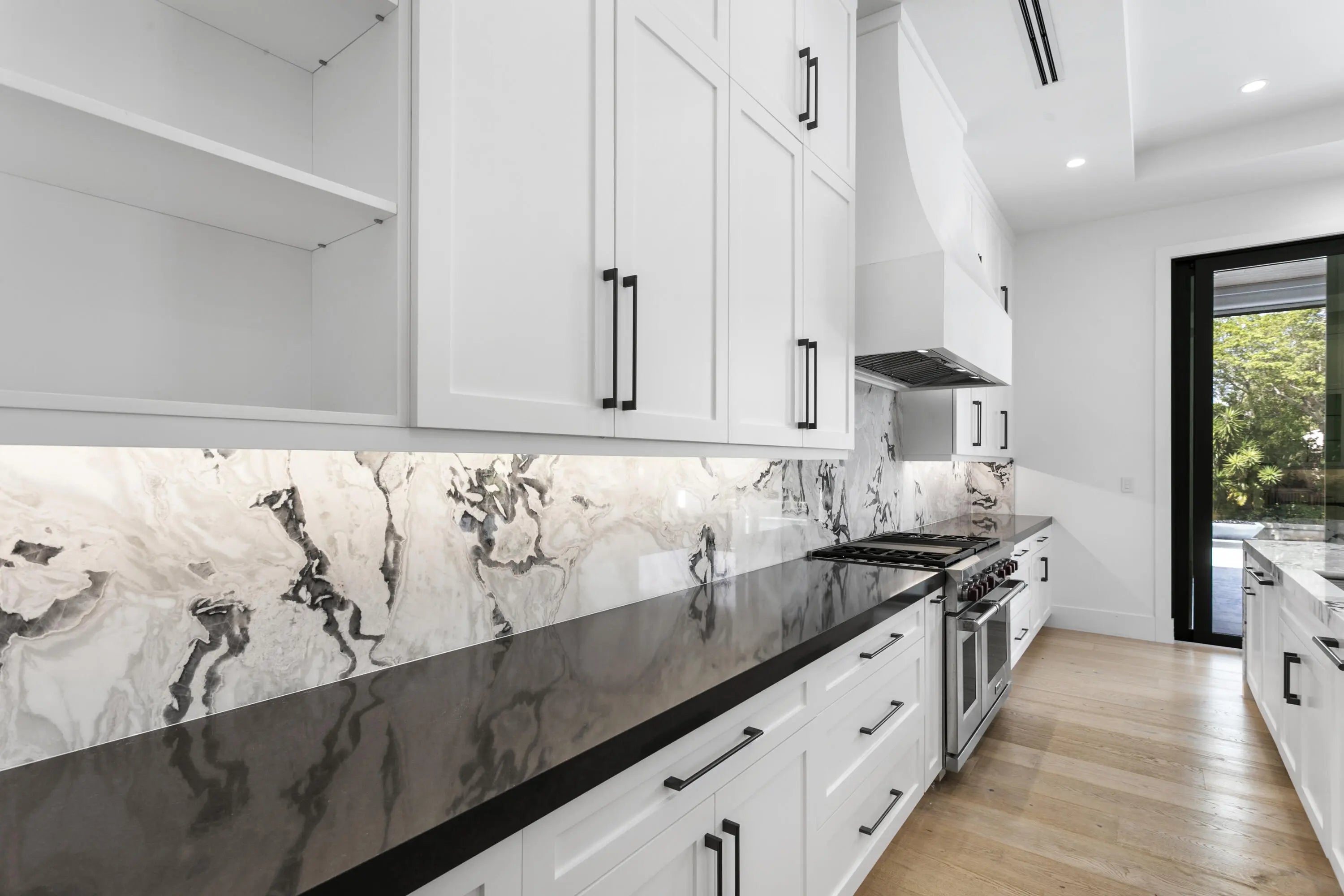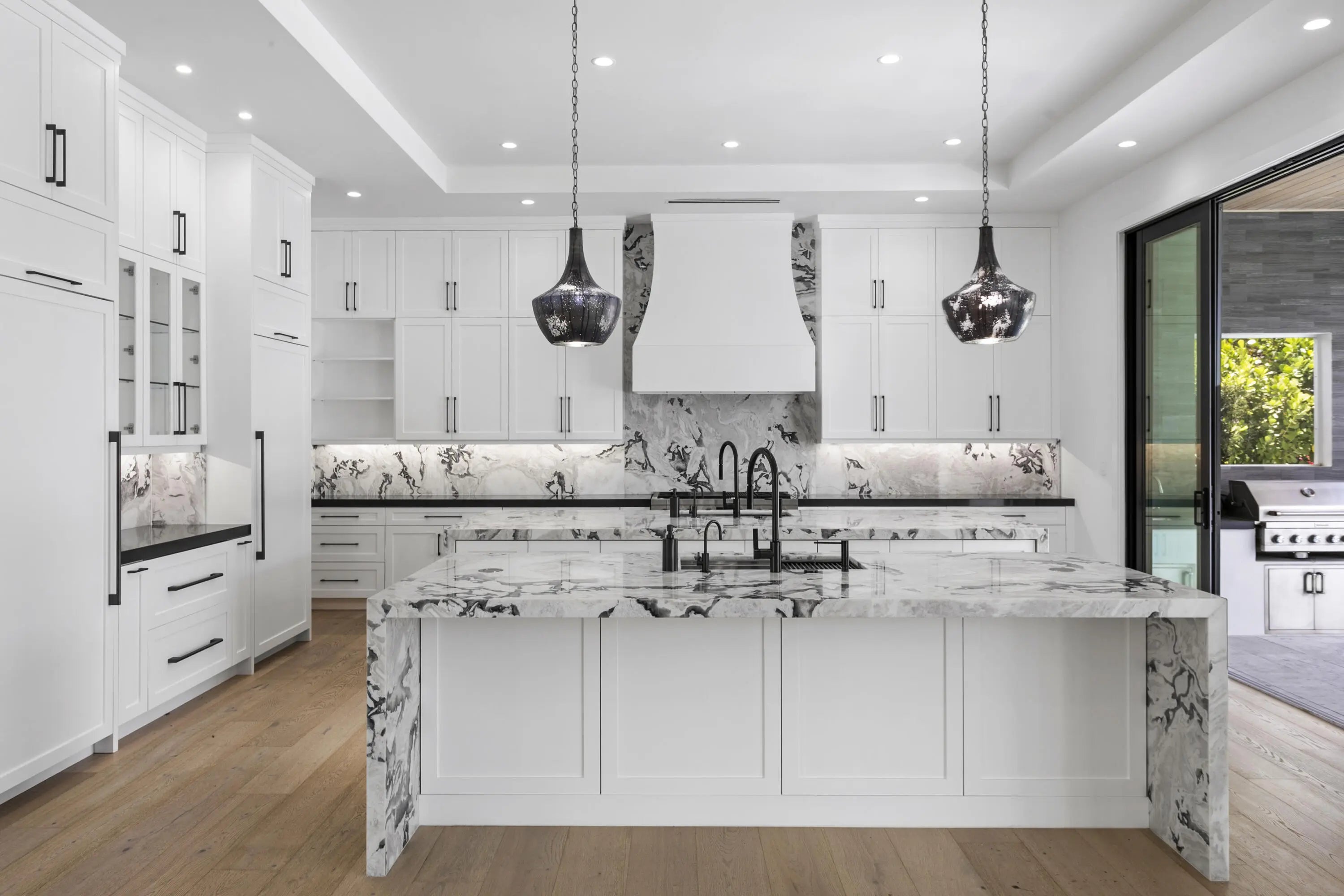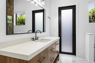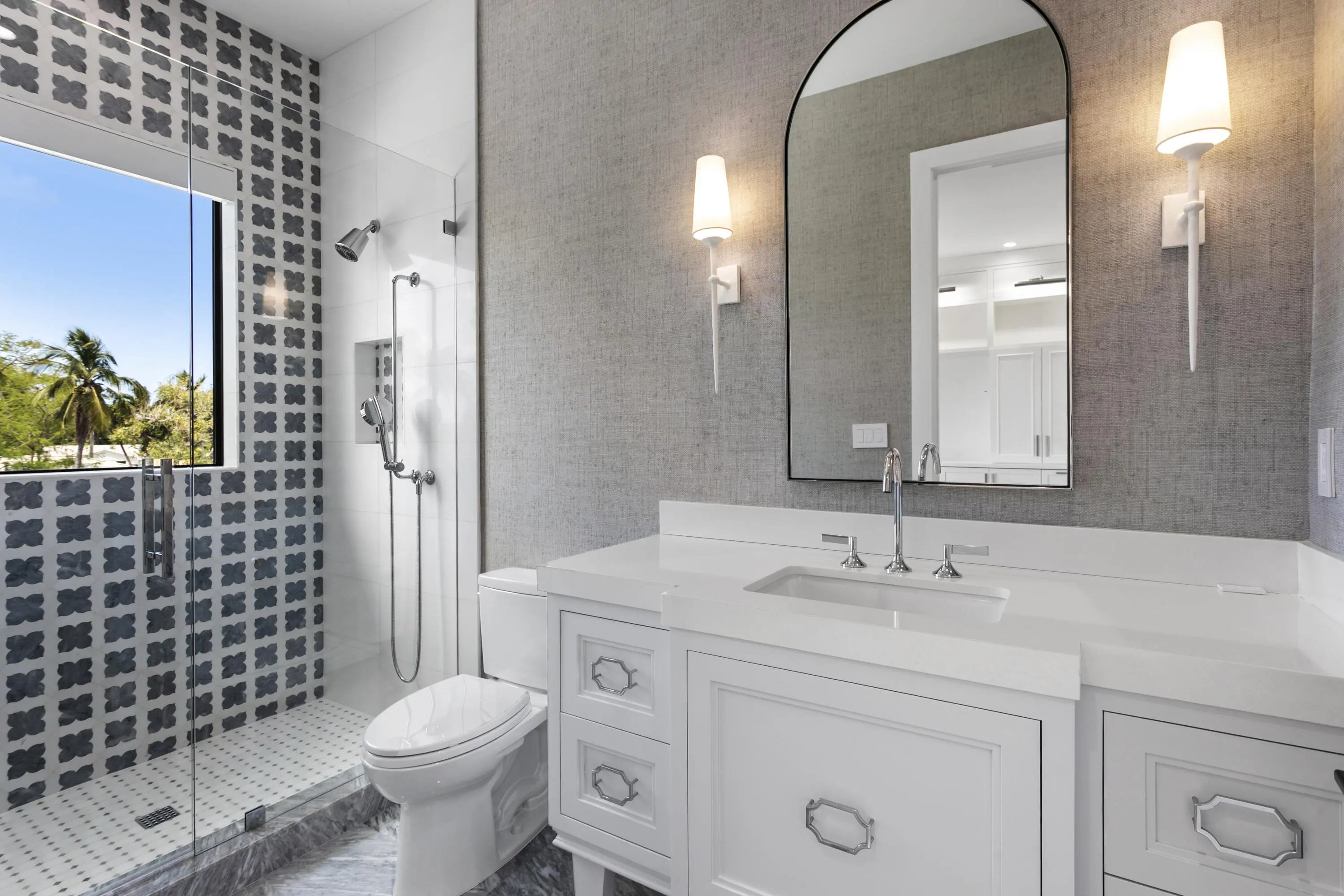 2022 Palm Beach waterfront residence, where timeless design meets modern luxury. Crafted to blend indoor and outdoor living, this home features soaring ceilings, expansive impact windows and doors, and stunning white oak hardwood flooring complemented by custom-built cabinetry throughout—creating a bright, open, and sophisticated atmosphere. The chef's kitchen is a true centerpiece, complete with dual islands, marble countertops, premium Wolf appliances, a Sub-Zero refrigerator, and a spacious walk-in butler's pantry. Designed for both comfort and convenience, the home offers upstairs and downstairs laundry rooms, a private guest suite with cabana bath, a dedicated home gym, and a sleek custom glass staircase. With 5 bedrooms and 5.1 bathrooms, the layout is both functional and flexible. The upstairs primary suite is a private retreat featuring dual vanities, a spa-like bath, an expansive custom walk-in closet with center island, and a separate shoe and accessory closet. Additional highlights include en-suite bathrooms in all secondary bedrooms, premium TOTO fixtures throughout, and a pre-installed elevator shaft for future convenience. Outdoors, enjoy 90 feet of seawall with dock space, perfect for boating enthusiasts. The resort-style backyard is designed for entertaining, featuring a pool with spa and fire pits, a covered patio with electric screens, outdoor kitchen with gas grill, and a covered balcony for elevated views. Additional features include a 3-car garage with acrylic flooring, full-home security system with cameras, electric shades, surround sound, and designer textured wallpaper accents.