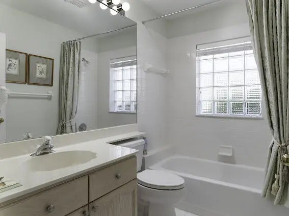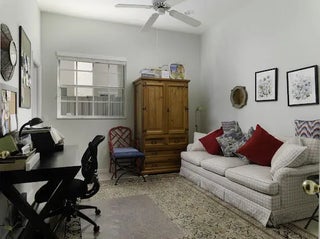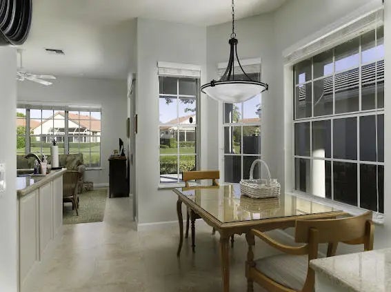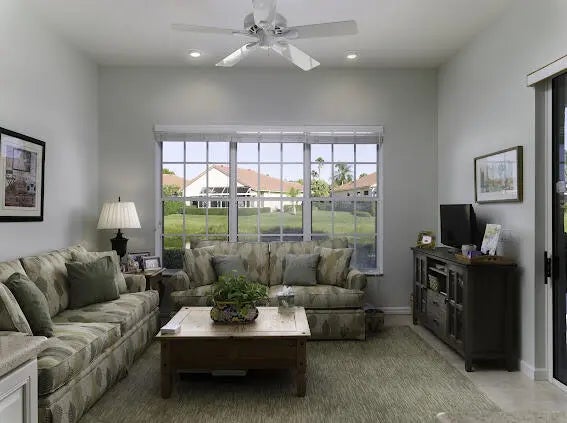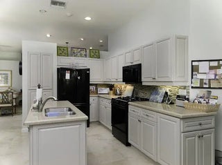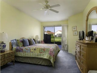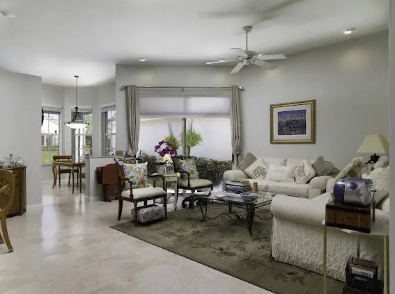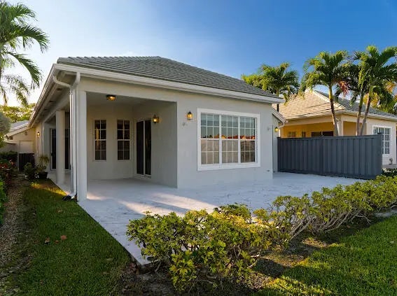 Welcome to this 2,023 sq ft CBS single-family home, featuring 3 bedrooms and 3 bathrooms in the prestigious Masters at Eagleton neighborhood of PGA National. The bright living room is filled with natural light from sliding glass doors and recessed ceiling lighting, complemented by off-white walls and neutral stone-look tile. Adjacent, the formal dining area offers a chandelier, wall sconces, and recessed lighting, seamlessly connecting to the open-concept living space. The kitchen boasts linen-toned paneled cabinets, granite countertops, a neutral mosaic glass tile backsplash, black appliances, a prep island with sink and dishwasher, and a sunny breakfast nook in a bay window. The cozy family room overlooks tranquil lake views and provides access to the covered patio. A spacious office with en-suite bath offers flexibility as a guest suite. The primary suite features a seating area, walk-in closet, and private en-suite with dual vanities, Roman tub, glass-enclosed shower, and water closet. The guest bedroom is bright and comfortable, offering generous closet space and perfect for welcoming visitors. Outdoor living is enhanced by a covered side patio off the living and family rooms and an open back patio off the primary bedroom, perfect for relaxing or entertaining while enjoying serene lake views.
