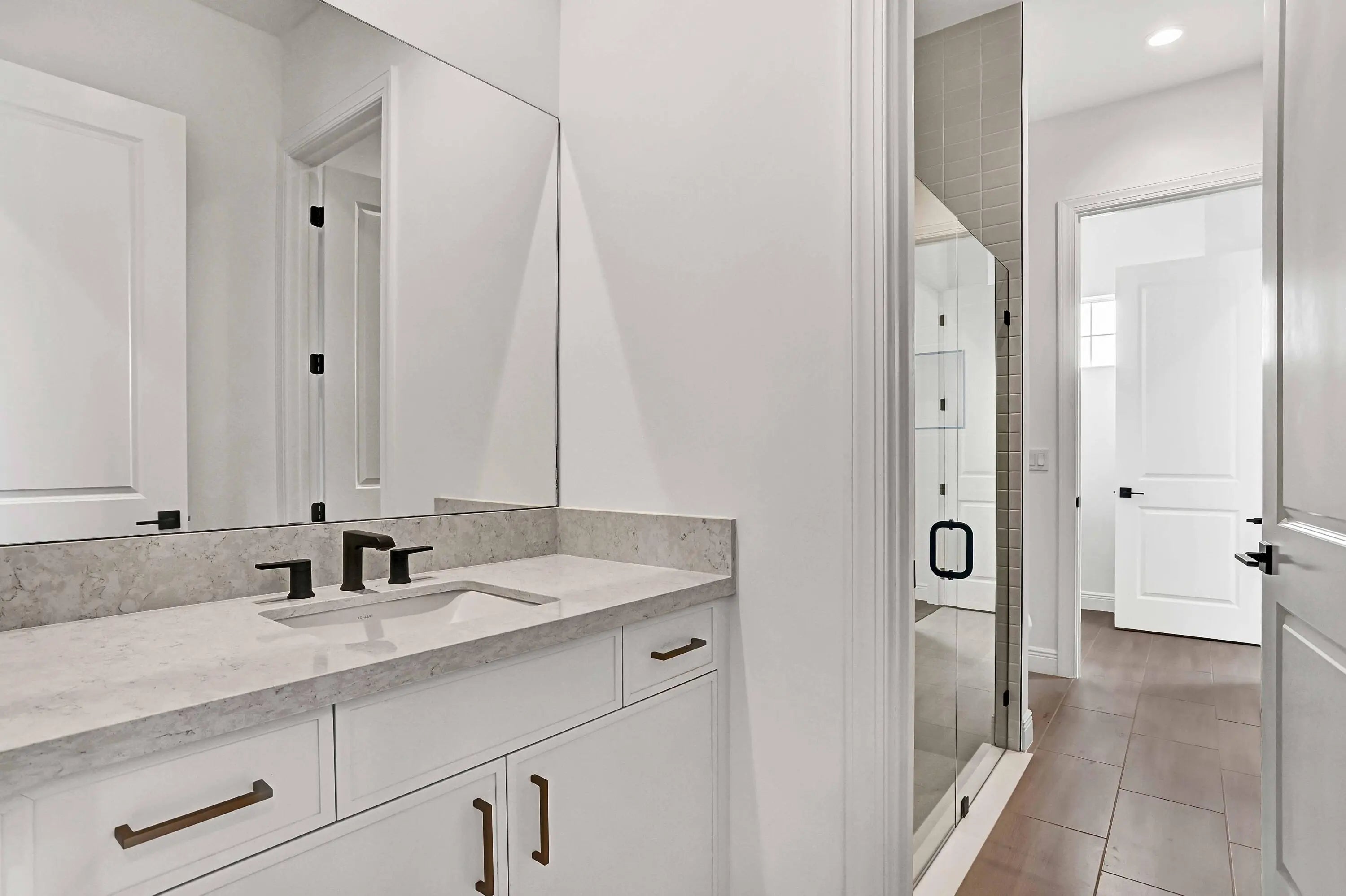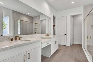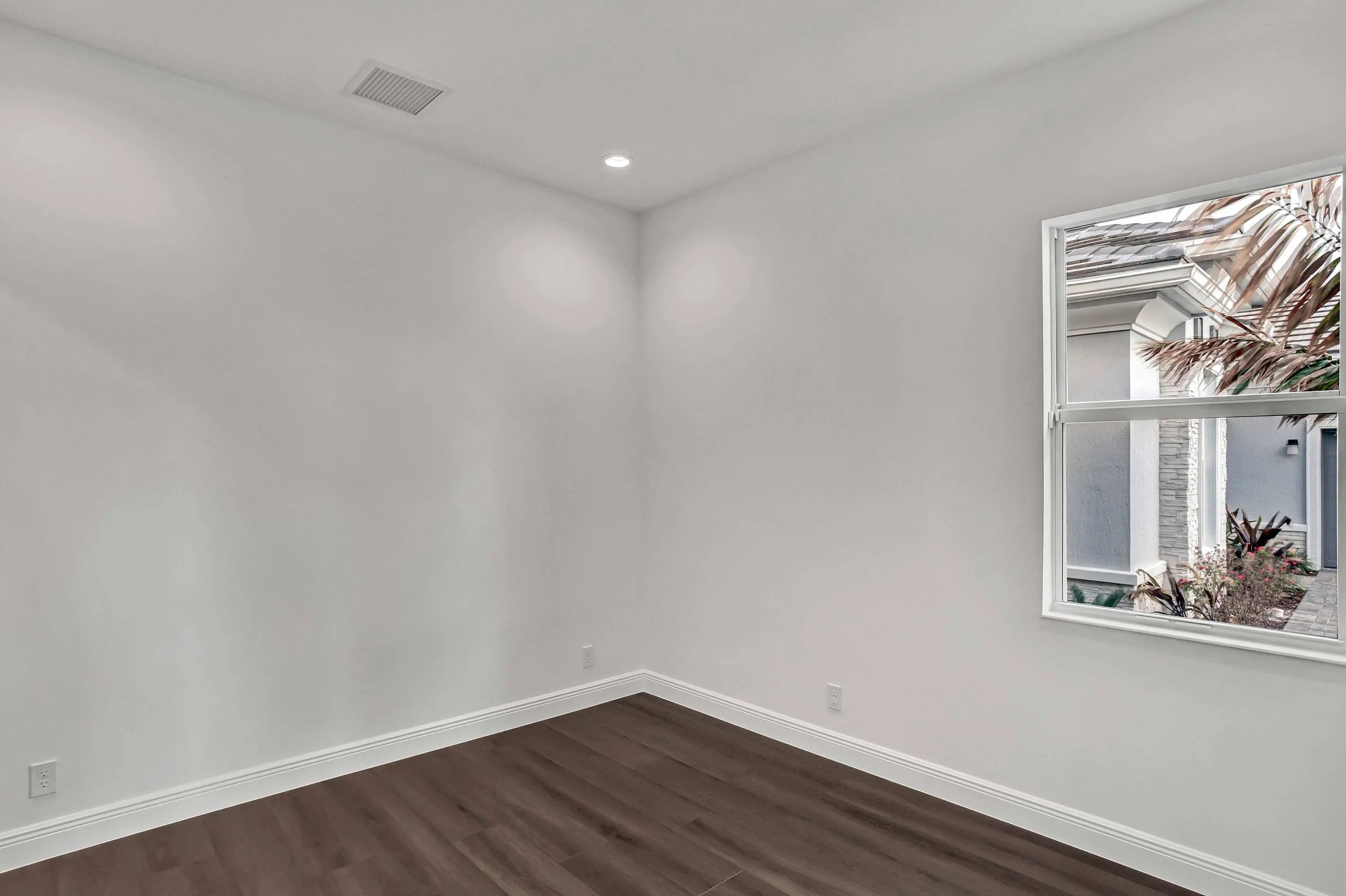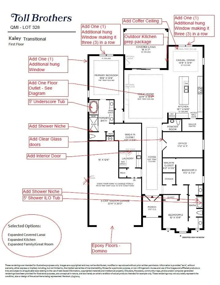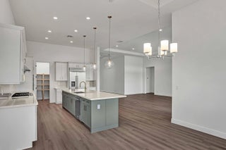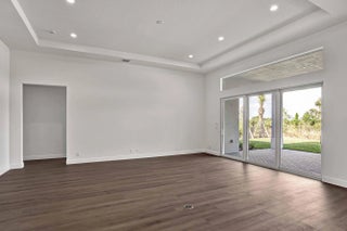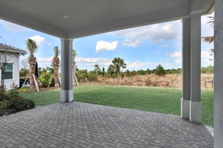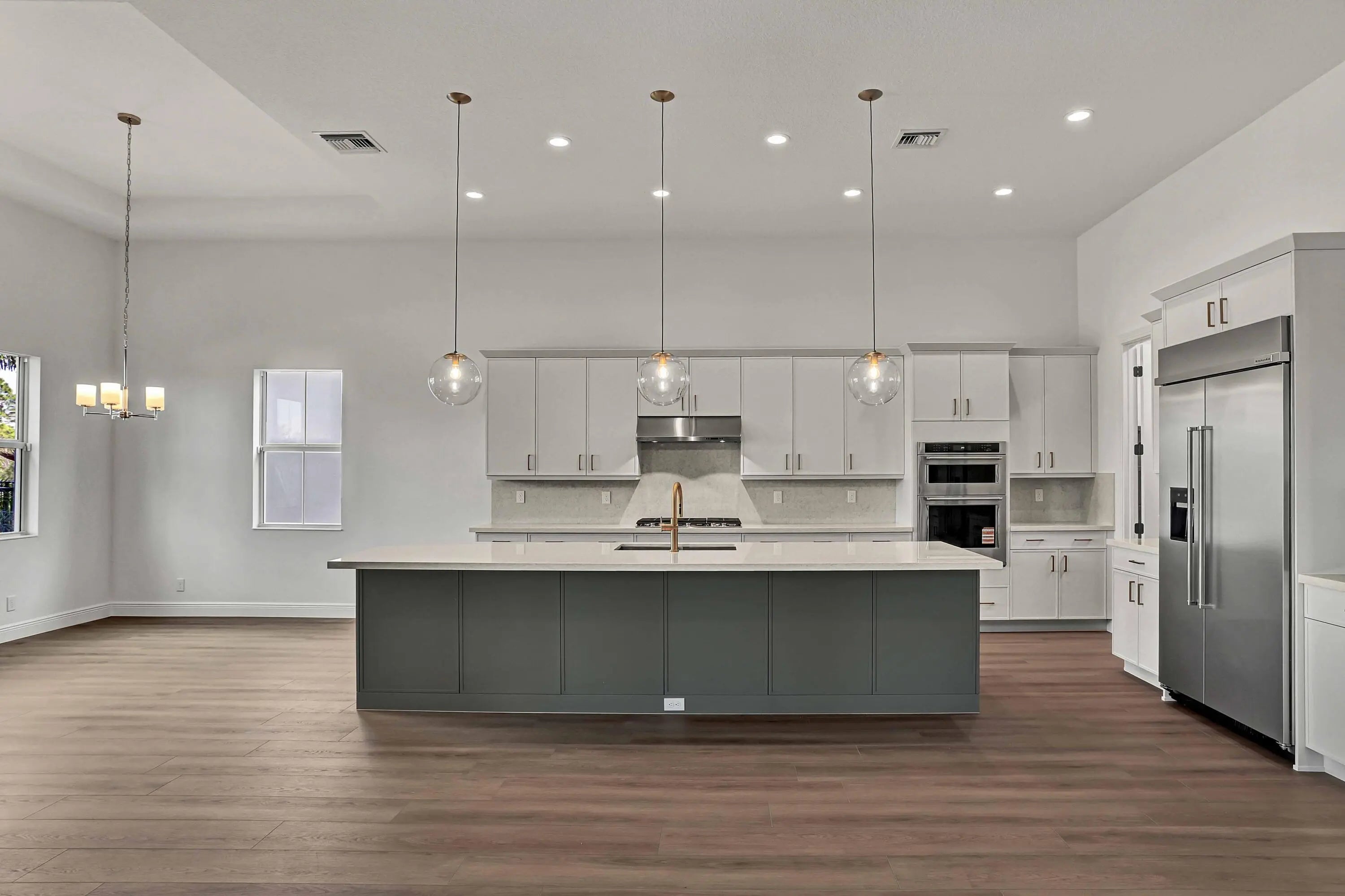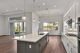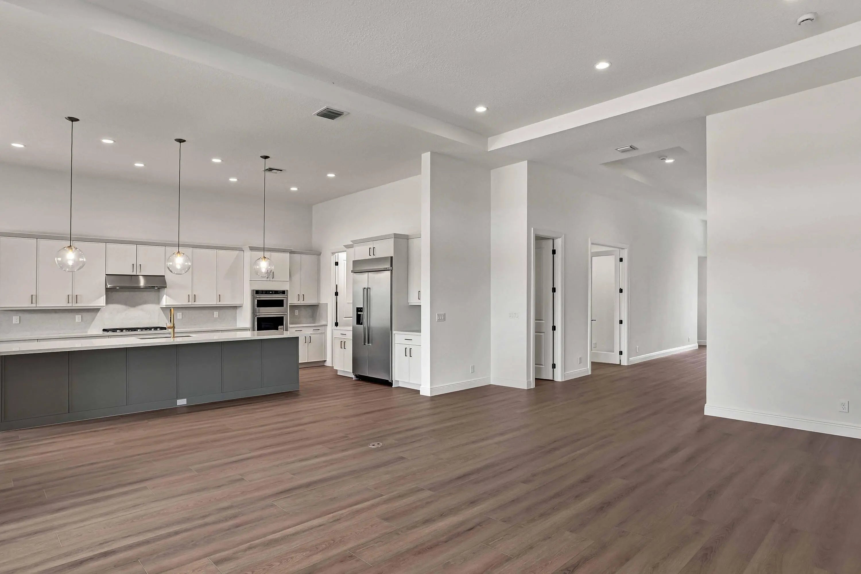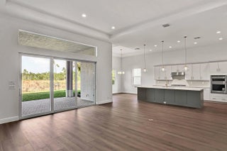 Welcome Home! Step into this stunning residence featuring a grand foyer with soaring 12-foot ceilings and a bright, open-concept design. Gorgeous LVP flooring flows seamlessly throughout, leading you into the expansive living area. Just off the entry, a sunlit study with glass French doors offers space for a home office or library. The chef-inspired kitchen impresses with stylish two-toned cabinetry, a walk-in pantry, and a designer quartz backsplash. The luxurious primary suite showcases white shaker cabinetry, a spa-like bath with a drop-in soaking tub, a walk-in shower with bench, and a spacious closet. A conveniently located powder bath adds comfort for guests, while secondary bedrooms provide ample space for family or visitors. Step outside to the expanded covered lanai, perfect for