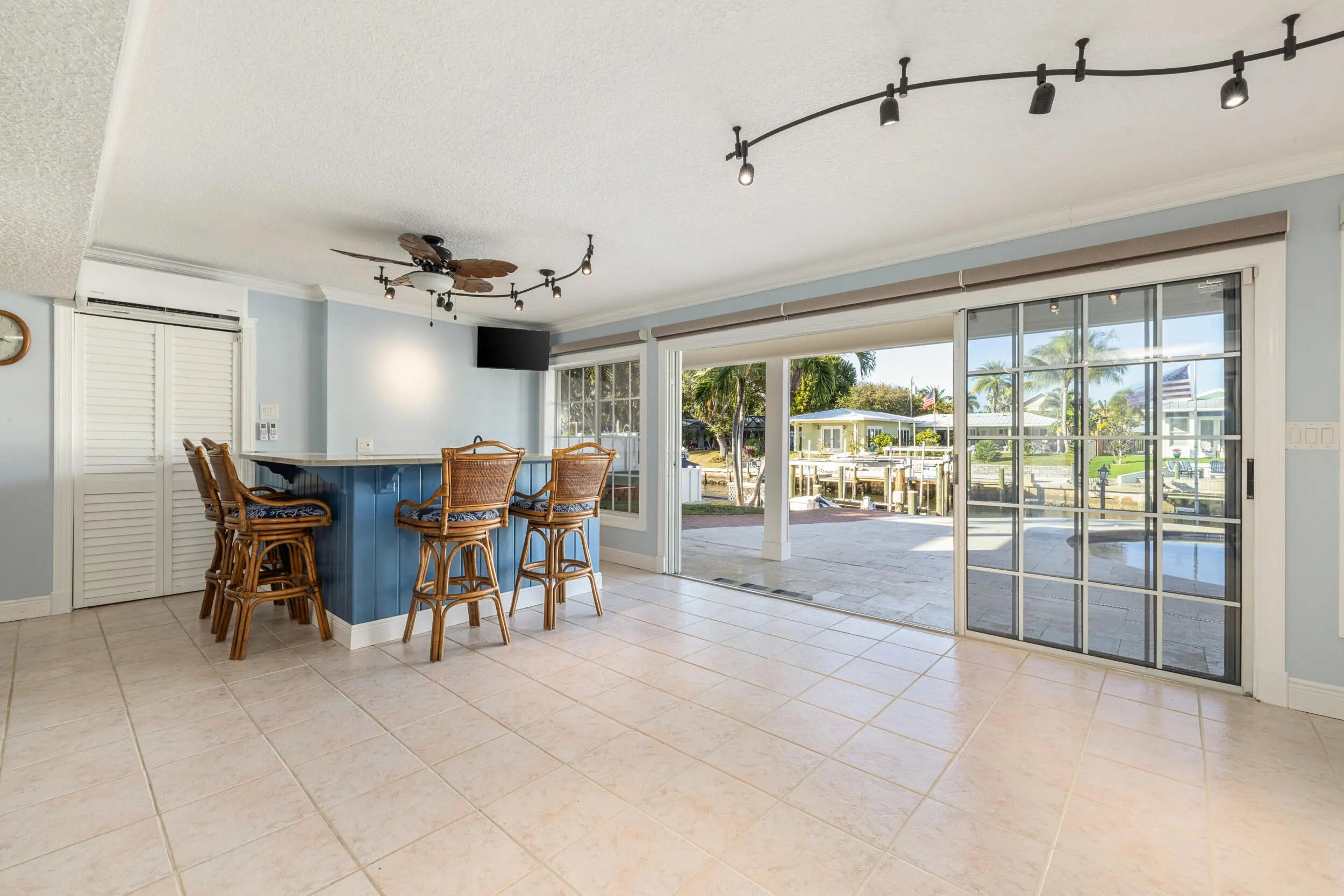 Set along a deep-water canal on a quiet cul-de-sac within one of North Palm Beach's most established, family-friendly streets, this waterfront residence reflects a calm, considered approach to coastal living one that values both refinement and function. With 80 feet of seawall, a decked-over dock, and two boat lifts rated at 16,000 and 12,000 pounds, the property offers seamless access to open water and a lifestyle shaped by time spent outdoors. Inside, light-filled interiors unfold through an open layout that maintains a constant visual connection to the water. The 2024 kitchen is intentionally curated, finished with quartzite countertops, a gas cooktop, wall oven, and new stainless-steel appliances, balancing everyday usability with elegance. The oversized primary suite is set apart as a private retreat, offering dual walk-in closets and a spa-style bath with a two-person Jacuzzi tub, double shower, and dual vanities. Two additional bedrooms with hardwood floors provide flexibility for guests or home office use. A generous family room, anchored by a gas fireplace and a built-in wet bar with beverage refrigerator and quartzite countertops, opens through a full three-panel slider to an oversized, vaulted-ceiling covered patio and expansive paver pool terrace. Outdoors, a custom 2014 pool equipped with an air chiller overlooks the deep-water canal, creating a seamless indoor-outdoor setting well suited for entertaining. Recent updates include a new roof (2024), gas water heater (2025), plantation shutters, crown molding, and solid-core doors, resulting in an enduring expression of modern coastal living.