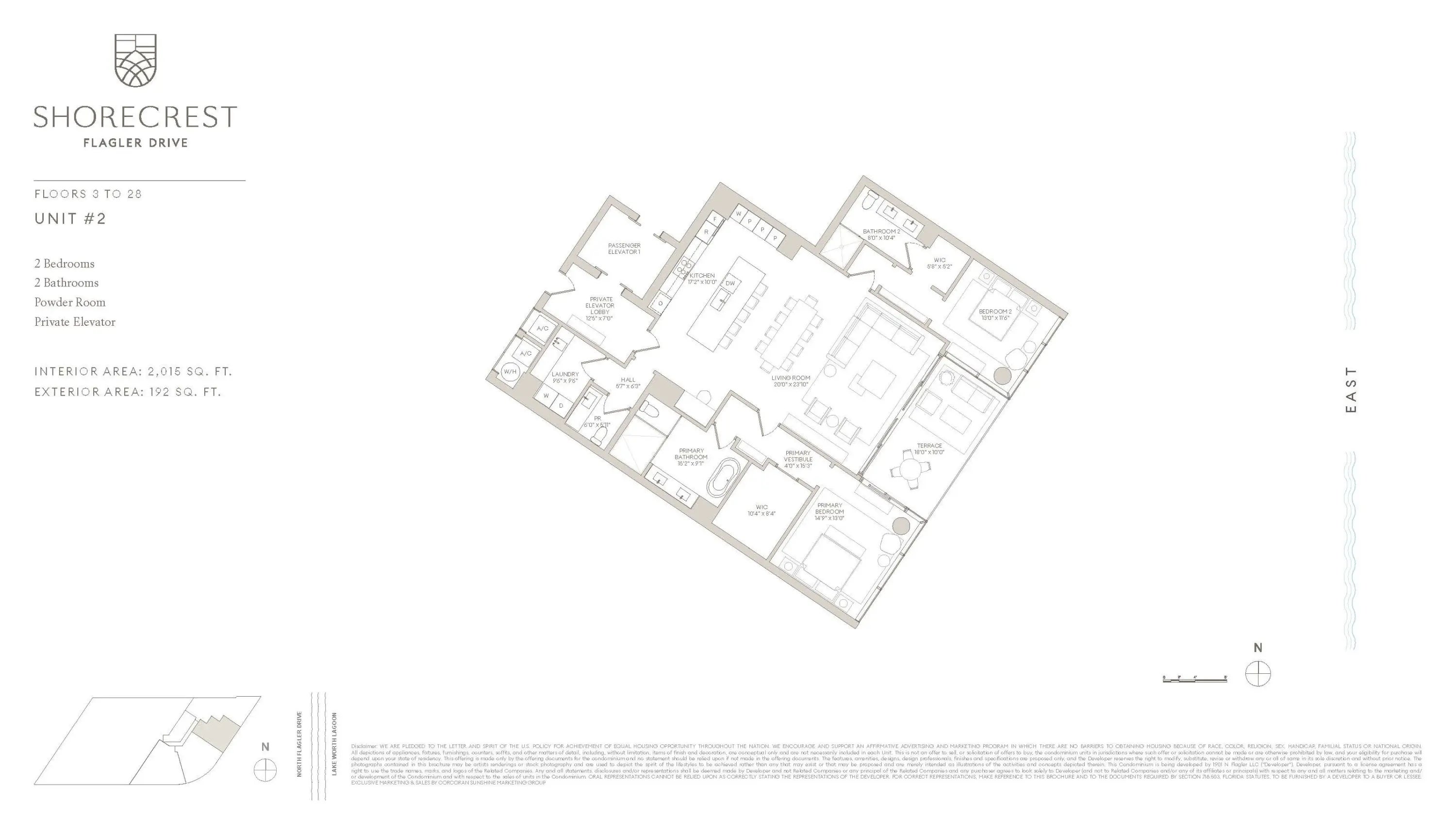 Shorecrest is a refined collection of just 100 one- to three-bedroom residences by Related Ross, with architecture by Roger Ferris + Partners. This East facing residence is a gracious split two-bedroom layout with a private elevator entry and a terrace off the Living Room and Primary Bedroom offering panoramic views of the Intracoastal. Designed to elevate waterfront living, Shorecrest features timeless interiors and exceptional amenities, all crafted with meticulous attention to detail. From the elegant porte-cochere on North Flagler Drive to the rooftop pool with iconic views, every element reflects a new standard of luxury in West Palm Beach.