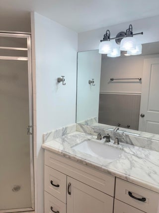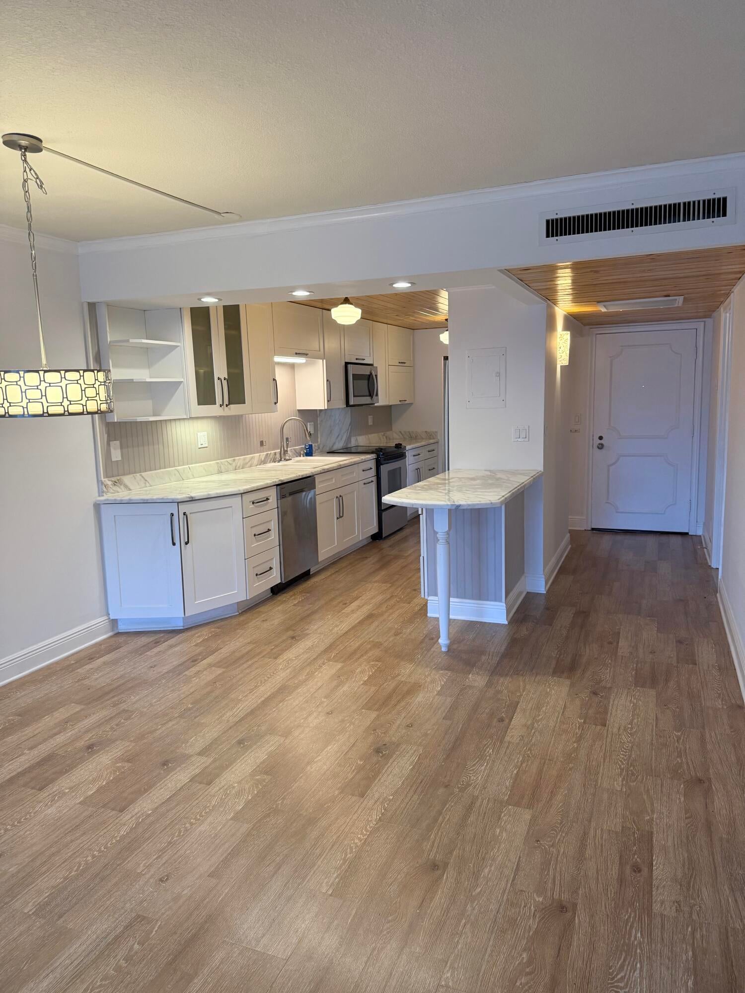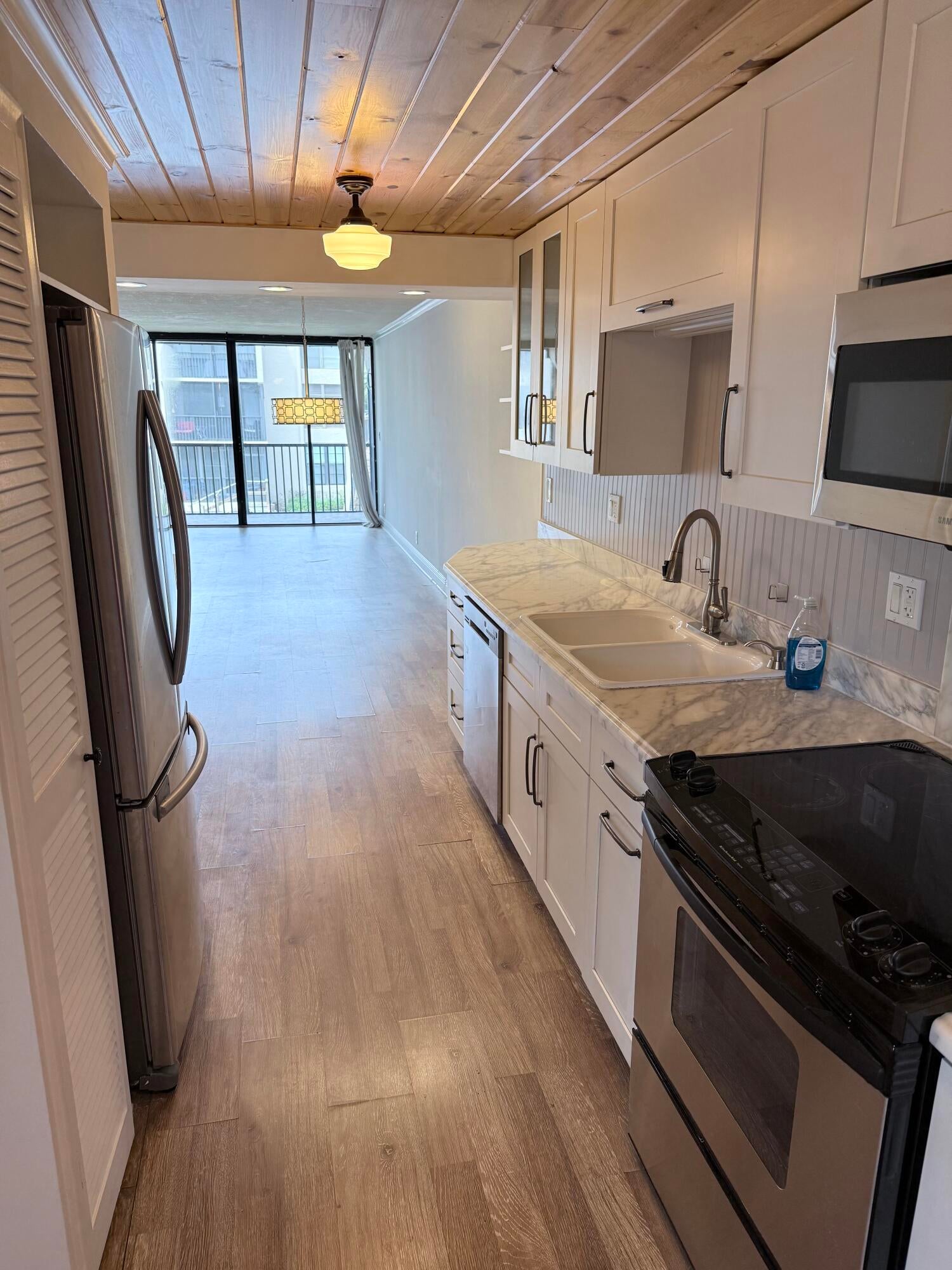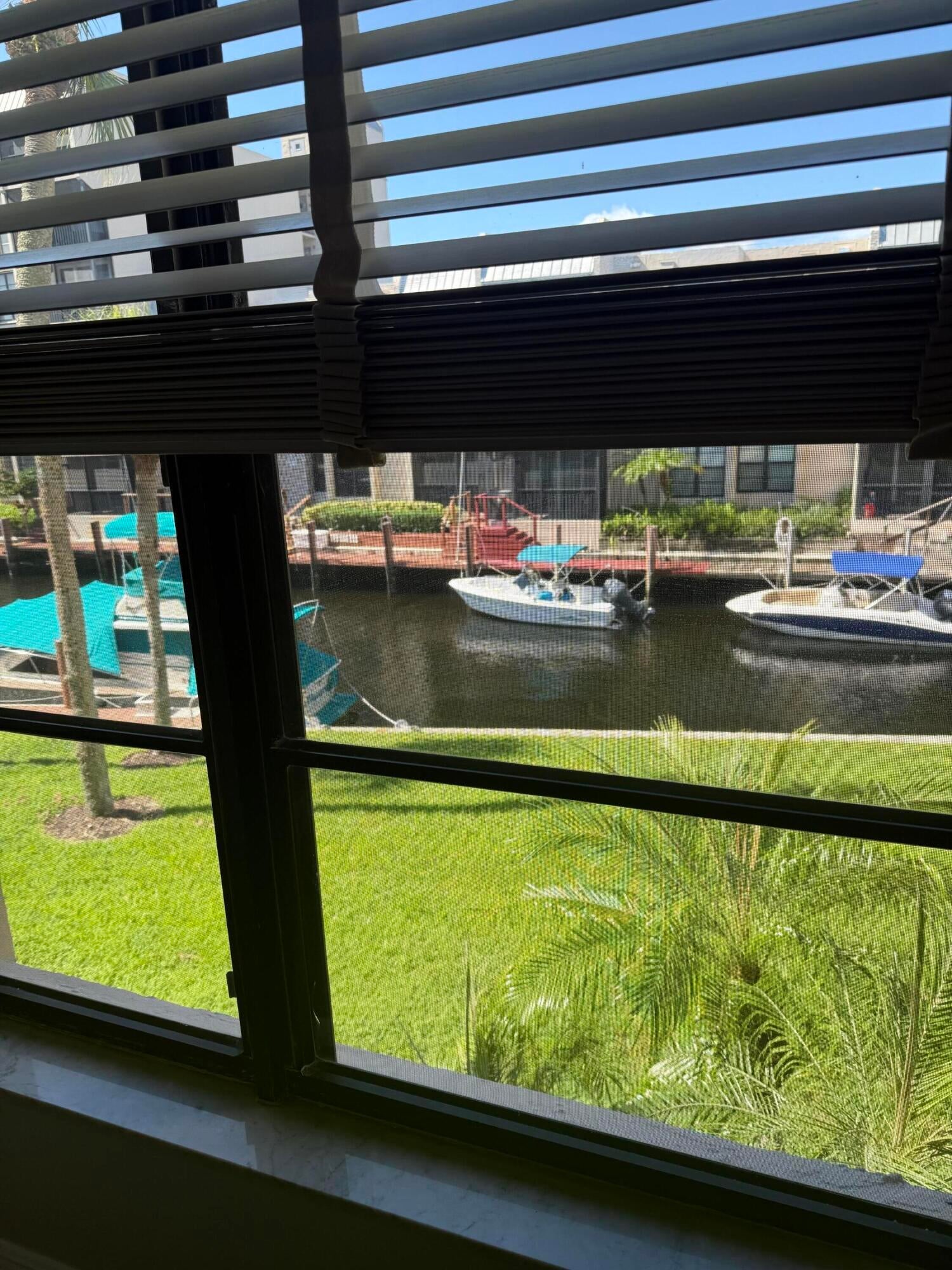 Beautifully updated 2nd floor corner unit with 2 ensuite bed/ baths, freshly painted in soothing gray and white hues. Walk in and see the water from your front door! A modern kitchen awaits with marble counters, white cabinets and SS appliances. All closets have been outfitted with new shelving. Primary suite has new carpeting. Bath has private water closet and marble flooring. Amenities: 24hr manned gate, 5 heated pools, lighted tennis & pickleball, EV charging. Additional storage on site inc. Rent includes water/sewer, cable w/HBO & hot water. Fantastic location, minutes to beaches, parks, and Mizner Parks fabulous shopping and dining