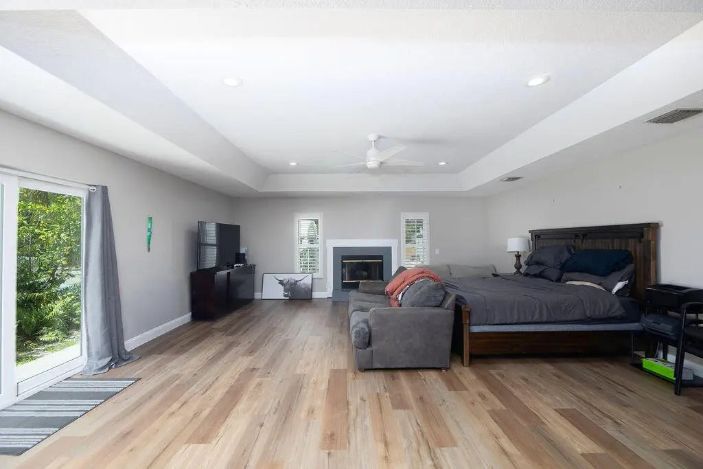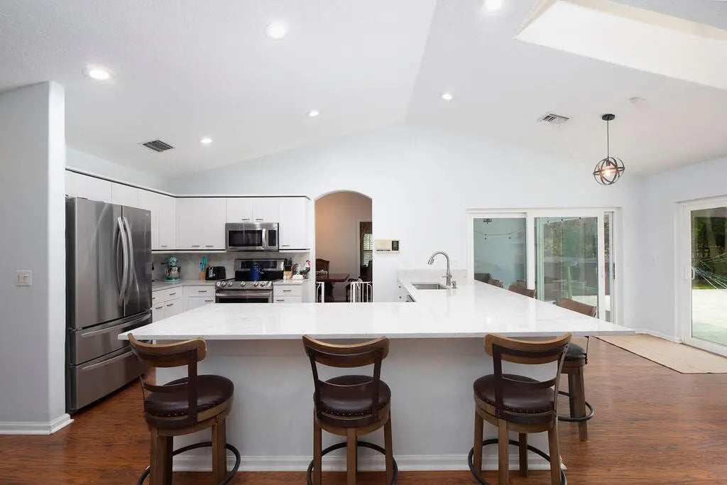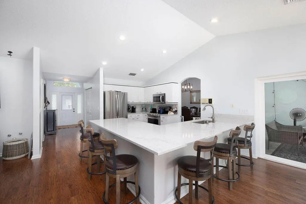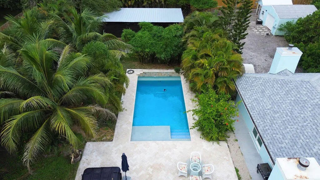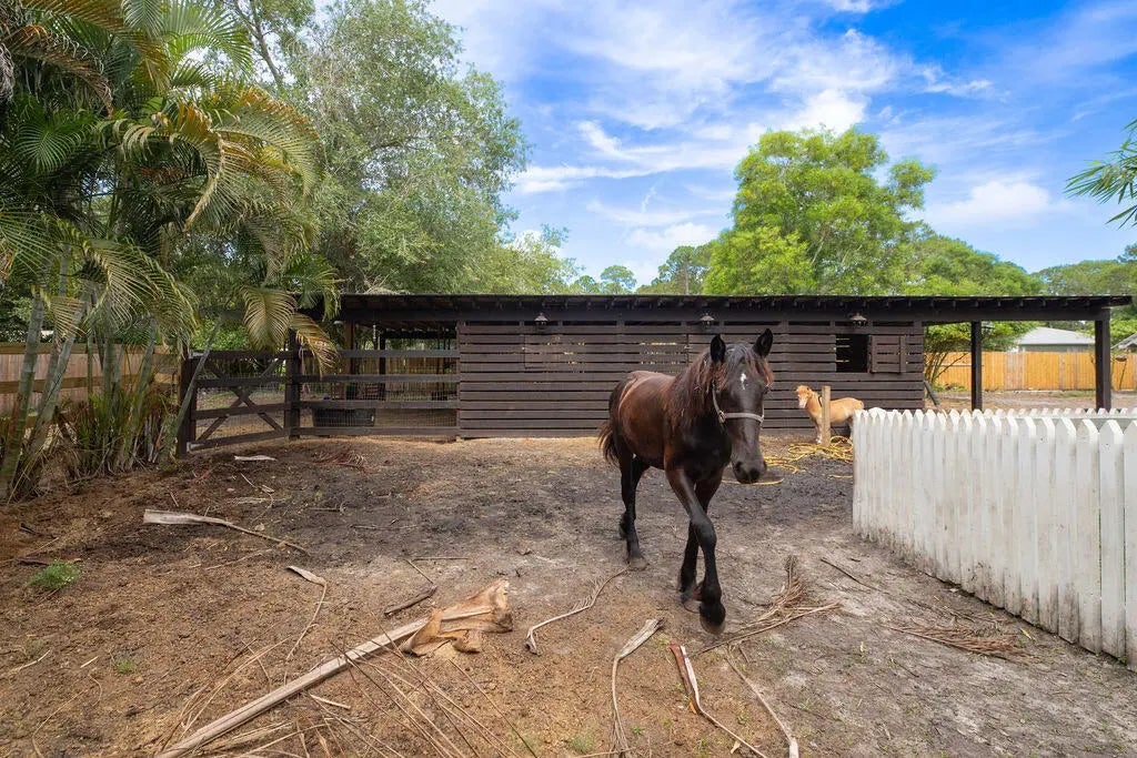 Experience the best of both worlds with this beautifully maintained pool home in Jupiter Farms--offering peaceful country living just minutes from all the conveniences of town. This versatile 4-bedroom, 3-bath layout is ideal for multi-generational living or potential rental income. The attached efficiency apartment features a private entrance, full kitchen with stainless steel appliances, vinyl flooring, quartz countertops and its own HVAC system. The main residence is a 3-bedroom, 2-bath split floor plan with a 2-car garage, high vaulted ceilings, LED lighting, and great natural light. The open kitchen overlooks the beautiful pool and travertine patio, perfect for entertaining. The primary suite includes a private office, walk-in closet, soaking tub, separate shower, and dual vanities.