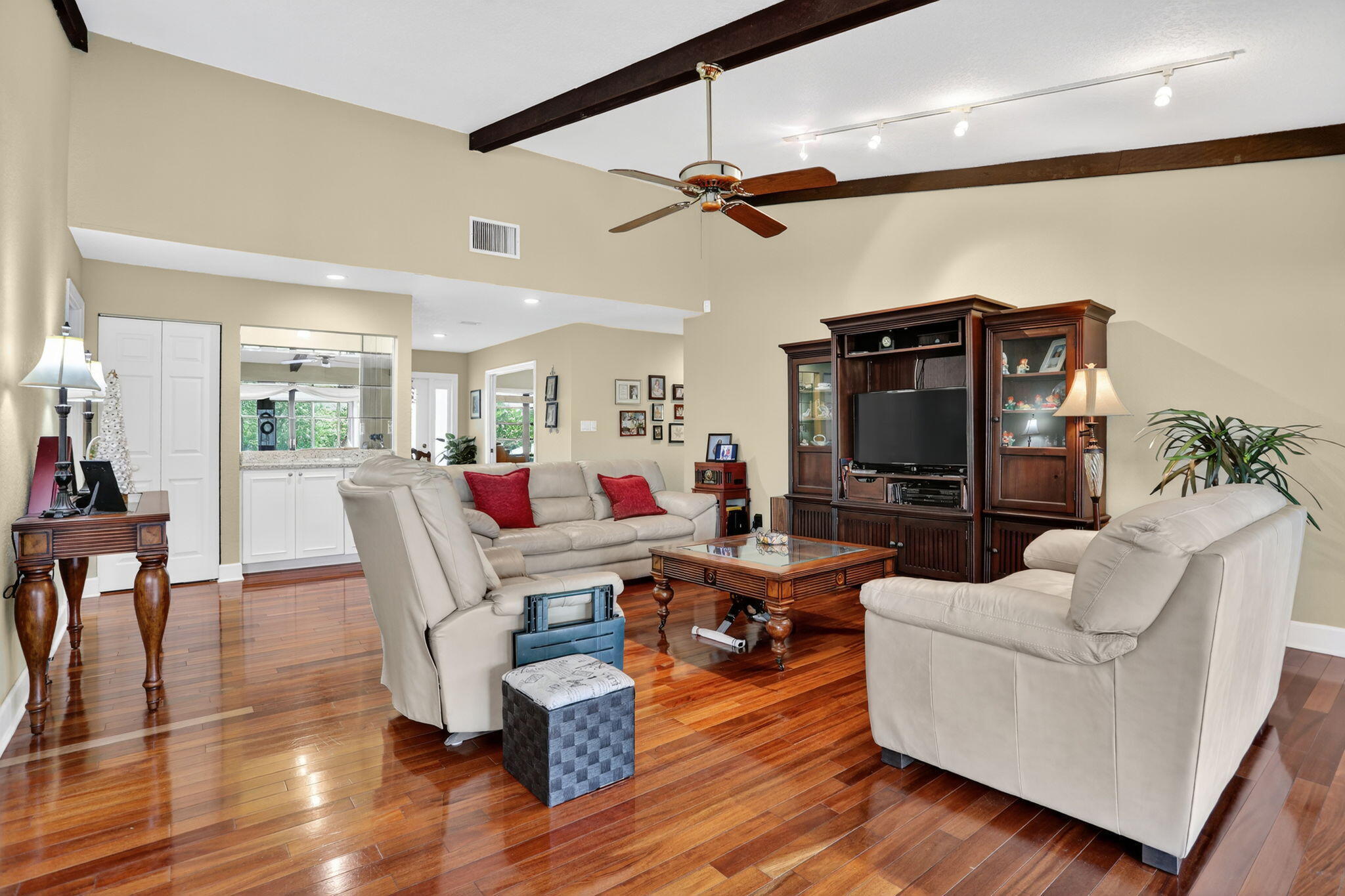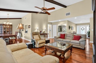 This 3 bed 2 bath single family home offers comfort, convenience and a relaxed 55+ lifestyle. Enjoy the spacious open floor plan, with beautiful wood beams and hardwood flooring. Private views from the air conditioned Florida room. The low HOA includes clubhouse, pool, and spa, lawn care, basic cable and internet; Yearly pressure cleaning of roofs, exterior Painting every 8 years. Excellent reserves. Do not miss out on this one!