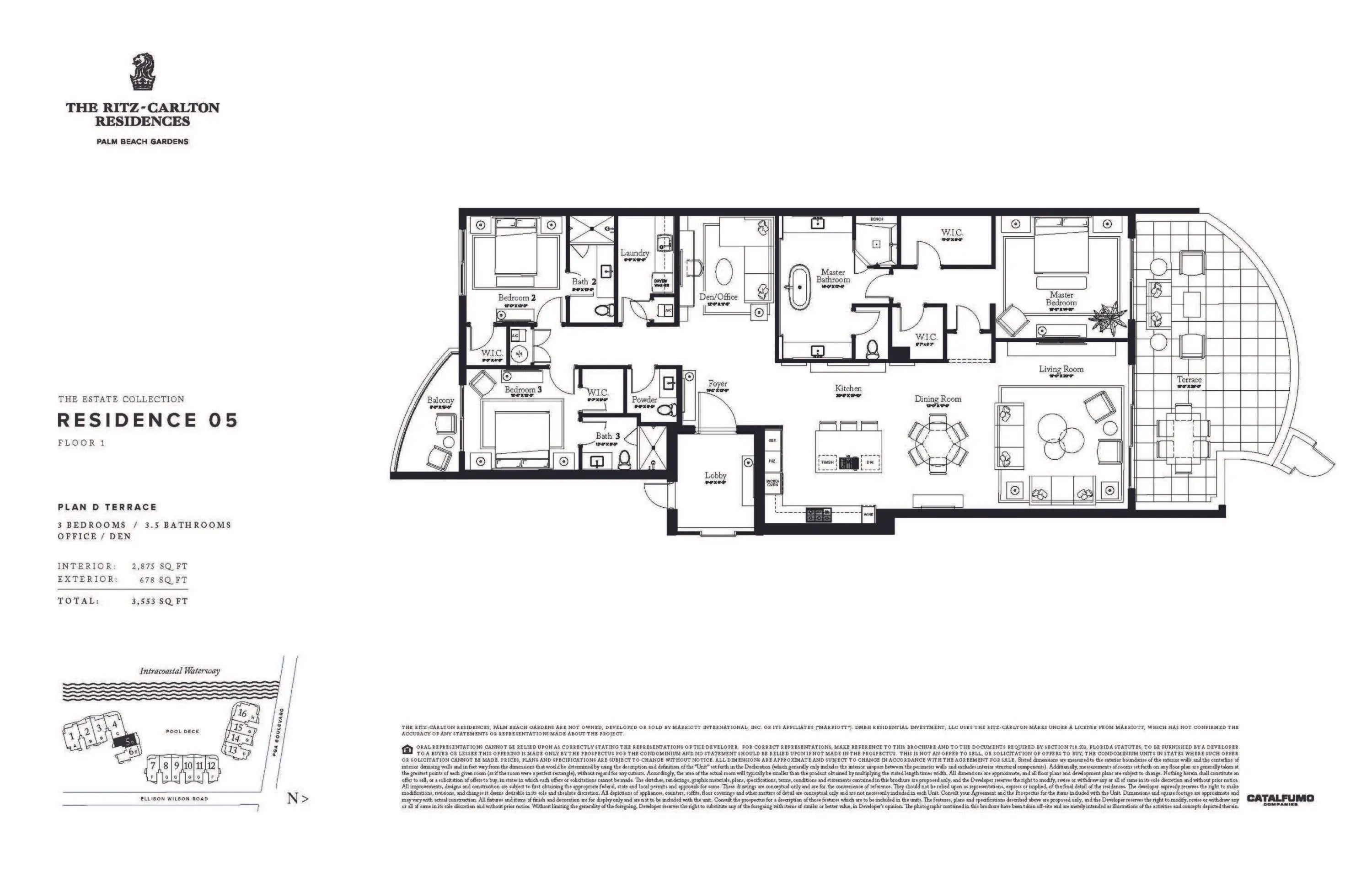 Residence 105D Terrace is a one-of-a-kind floorplan. This 3BR+Den, 3.5BA home offers nearly 700 sq ft of private outdoor living, incl. a patio w/ direct access to terrace-level amenities 30 feet above the Intracoastal. Terrace-level amenities incl. putting greens, lush garden sanctuaries & immediate proximity to the resort-style infinity-pool & cabanas below. With over 20,000 sq. ft. of amenities, the residence showcases European oak-finish cabinetry, Wolf & Sub-Zero appliances w/ gas cooktop, & triple-pane floor-to-ceiling impact sliding glass doors framing expansive views. 2 garage spaces included. As an exclusive residential building w/ no hotel component, ownership combines the privacy of a dedicated community w/ the legendary services of The Ritz-Carlton. Expected Completion Mid-2026