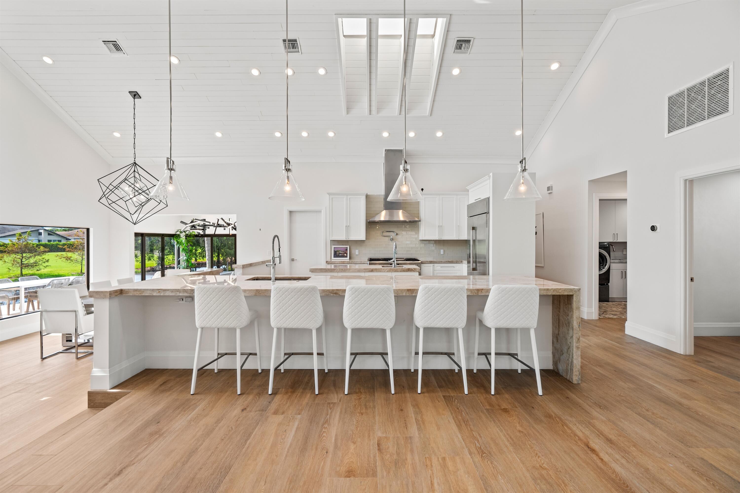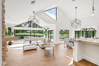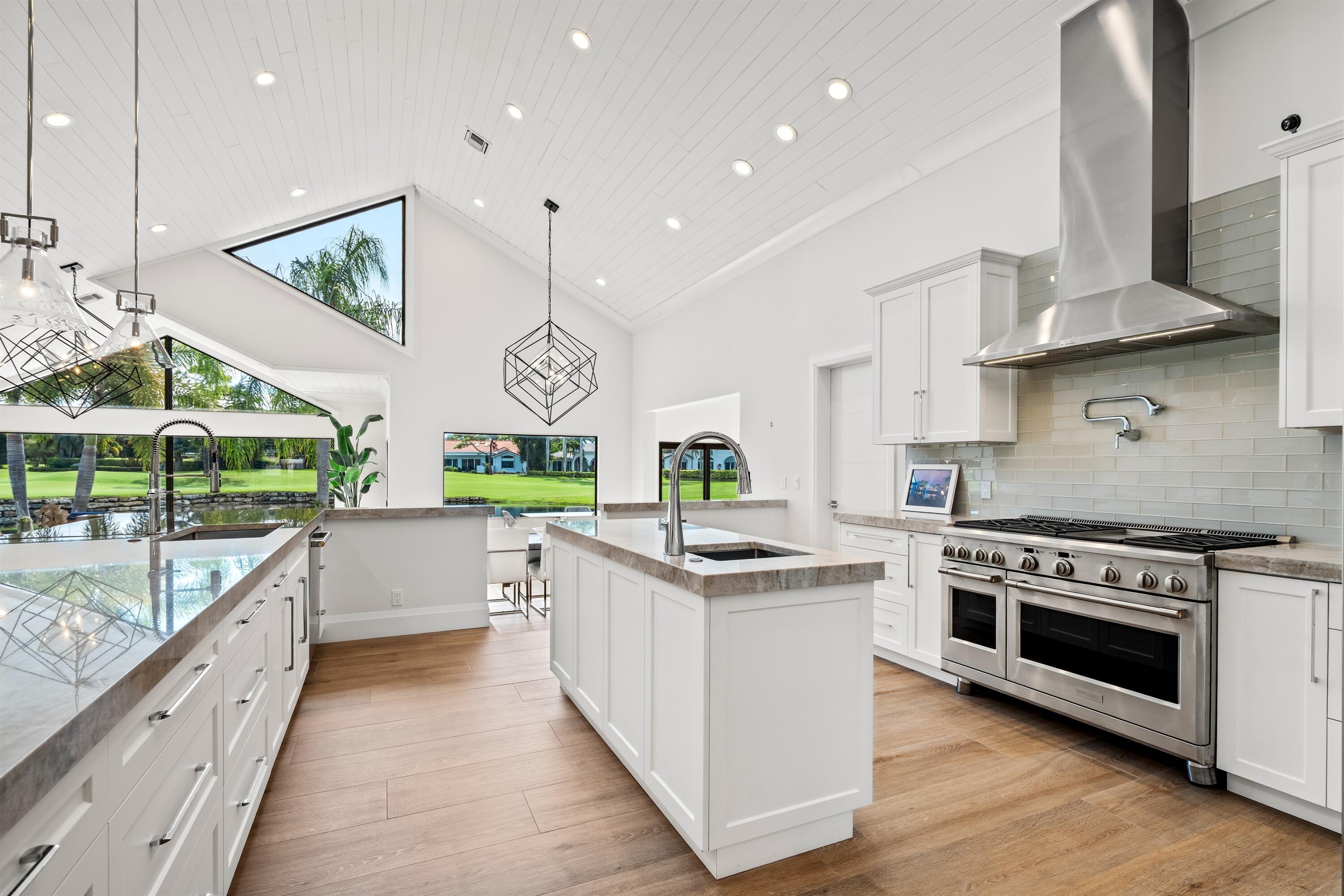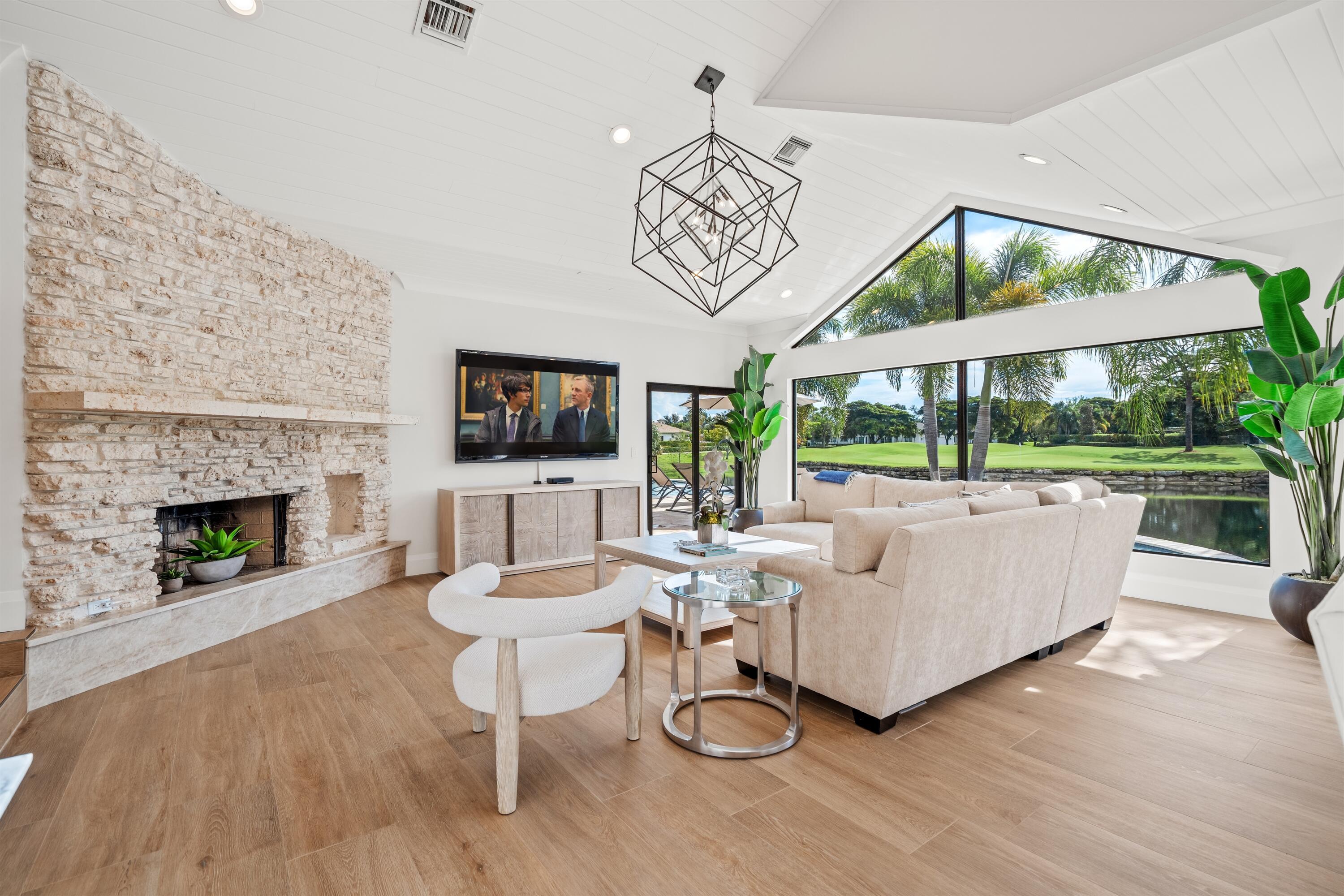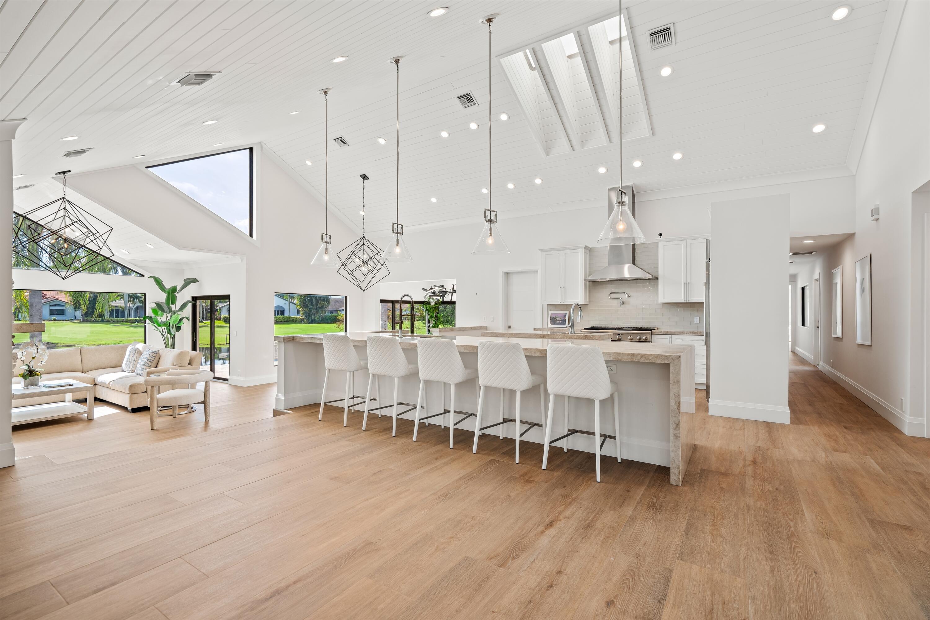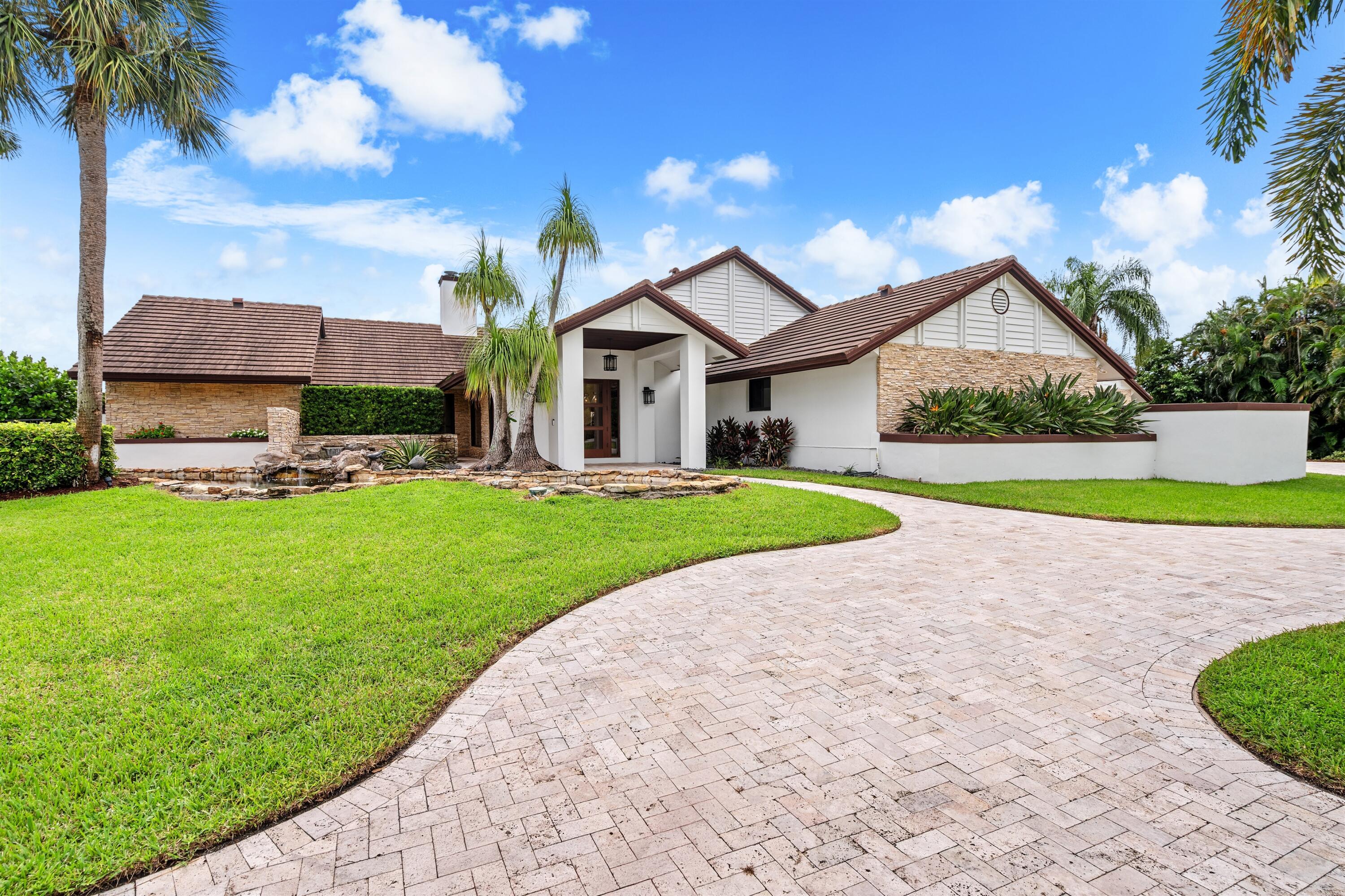 Enveloped within the beauty of its natural setting and defined by luxury, this completely remodeled East Coast style residence captures tranquil panoramic lake and fairway views as well as beautifully manicured fairway vistas from every room. With four bedrooms and spanning 4,714+/- total square feet, details throughout include dramatic tongue-and-groove vaulted ceilings punctuated by skylights, wide-plank washed-oak imported porcelain flooring, and window-walls of impact glass throughout. From the double-door entry, an inviting lounge, with a built-in bar topped by quartzite and featuring a refrigerated wine tower, introduces the dramatic open-floorplan living area of this spectacular residence. The chic great room features tongue and grooved wood vaulted ceiling, a wood-burningfireplace and window walls that capture expansive lake and fairway views, while the lounge and dining area directly access the gourmet island kitchen, fitted with Shaker-style cabinetry, quartzite waterfall counters, sea-glass backsplashes, high-end Monogram stainless-steel appliances and a pantry providing generous storage. The grand primary bedroom suite is especially lavish with a private seating area highlighted by a wood-burning fireplace and sliding glass doors that lead out to the pool patio. Completing the suite is a custom-fitted boutique closet and a spa-inspired marble bathroom, finished with dual sinks, a soaking tub, a walk-in glass-enclosed shower and a separate water closet. All bathrooms are remodeled with marble and European-imported tile. Along with the three bedrooms and the office, the layout also comprises a half-bath, laundry room, and oversized garage, with durable epoxy-coated flooring, accommodating two cars and a golf cart. Amenities include two circulating hot-water heaters for instant hot water, built-in central vacuum system, whole-house generator, new roof, new pool heater, newer multizone air-conditioning system, propane gas tanks, an outdoor shower, and side-load garages. Ready for a discerning owner's immediate enjoyment, everything has been updated in this stunning residence in this prime Delray Beach location. DISCLAIMER: Information published or otherwise provided by the listing company and its representatives including but not limited to prices, measurements, square footages, lot sizes, calculations, statistics, and videos are deemed reliable but are not guaranteed and are subject to errors, omissions or changes without notice. All such information should be independently verified by any prospective purchaser or seller. Parties should perform their own due diligence to verify such information prior to a sale or listing. Listing company expressly disclaims any warranty or representation regarding such information. Prices published are either list price, sold price, and/or last asking price. The listing company participates in the Multiple Listing Service and IDX. The properties published as listed and sold are not necessarily exclusive to listing company and may be listed or have sold with other members of the Multiple Listing Service. Transactions where listing company represented both buyers and sellers are calculated as two sales. "No payments made until title passes" Some affiliations may not be applicable to certain geographic areas. If your property is currently listed with another broker, please disregard any solicitation for services. Information published or otherwise provided by seller, listing company or its representatives is deemed reliable but are not guaranteed and subject to errors, omissions, or changes without notice. Copyright 2025 by the listing company. All Rights Reserved.
