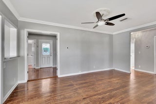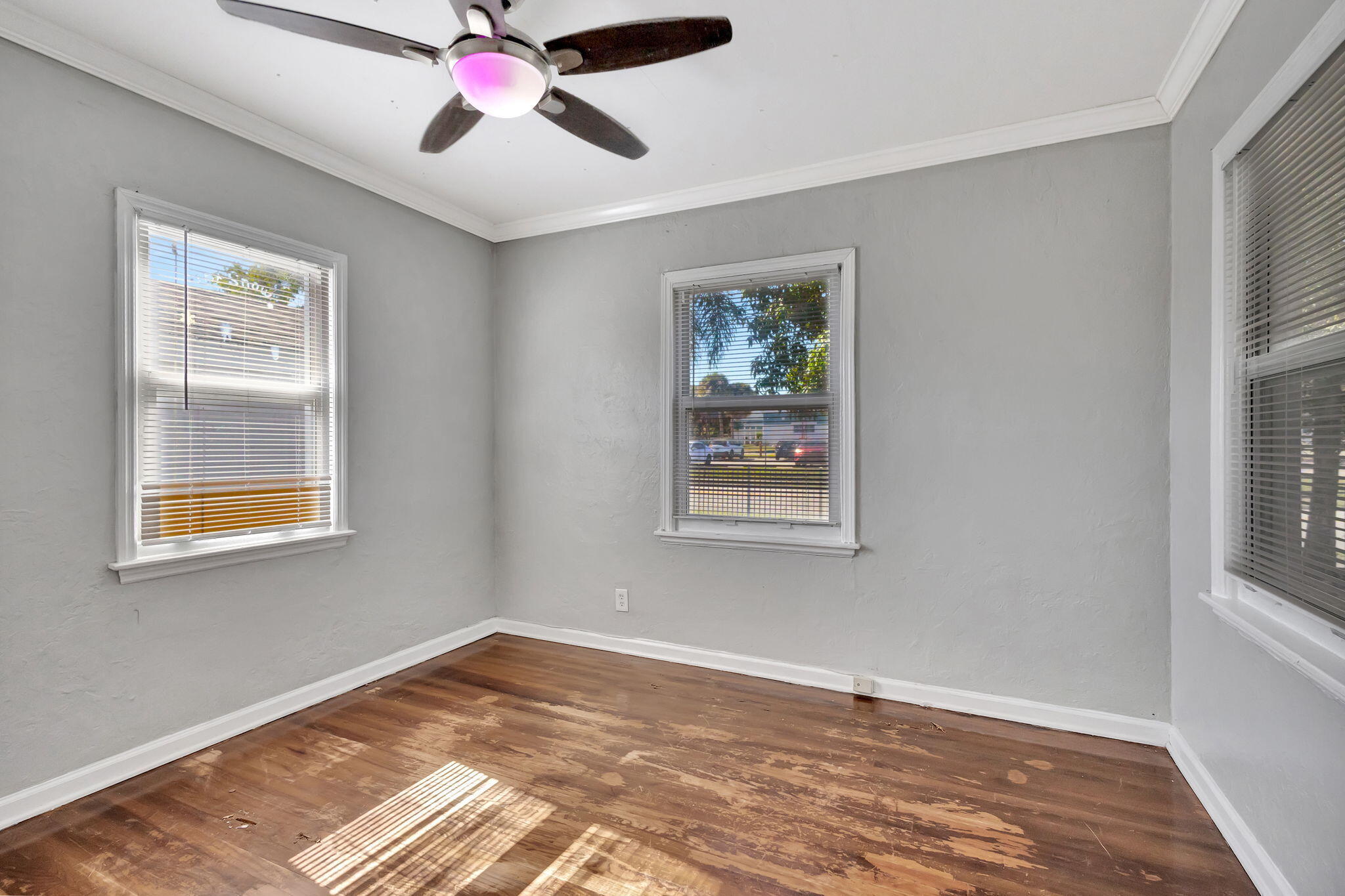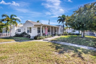 A welcoming covered porch sets the tone for this charming four-bedroom, two-bath home just 5 miles from the beach. Inside, natural light fills the bright and airy layout, highlighted by crown molding, wood floors and a kitchen with crisp white cabinetry, french doors, and a buffet pass-through. Central A/C keeps the home comfortable throughout, with a window unit in the primary bedroom for separate cooling. The fenced yard offers plenty of space for pets or gardening, while shared laundry access adds everyday convenience.This home offers both convenience and charm--all while being minutes from the shops, dining, and vibrant energy of downtown West Palm Beach. Whether you're seeking a serene retreat or a well-located spot close to it all, this is the perfect place to call home.