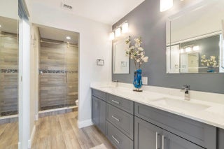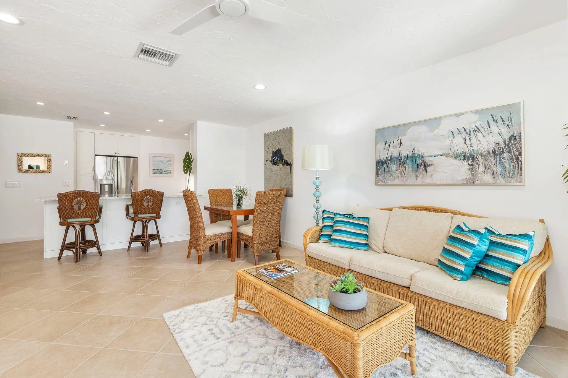 Watch the parade of Boats go by and dock your boat from this beautifully renovated 3 bedroom 3 bath home. Impact windows & doors throughout. Entertaining is effortless w/an open living area to kitchen w/white quartz counters, white shaker cabinets & s/s appliances. Enjoy ocean breezes from your covered screened-in patio w/fan or BBQ on your uncovered patio of 24X24 white marble tile. All 3 bathrooms have been completely remodeled w/designer tiles& quartz counters. There are 2 very large private bedrooms upstairs w/ensuite bathrooms & plantation shutters. Panoramic waterviews await you from the primary suite. Large walk-in closet, linen closet,double sinks in vanity& frameless glass shower enclosure.Newly renovated clubhouse w/pool, fitness,spa & newly renovated marina & docks.