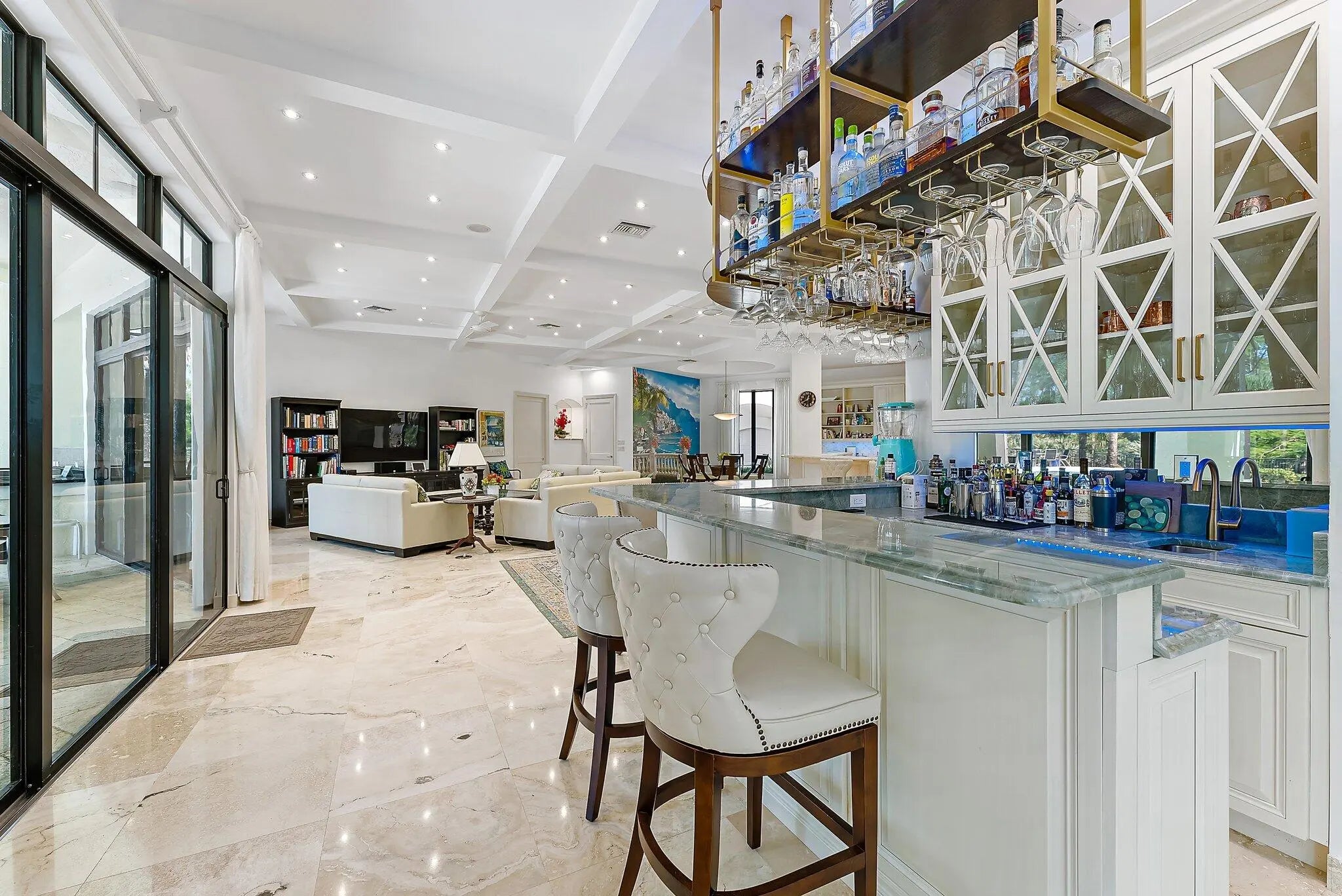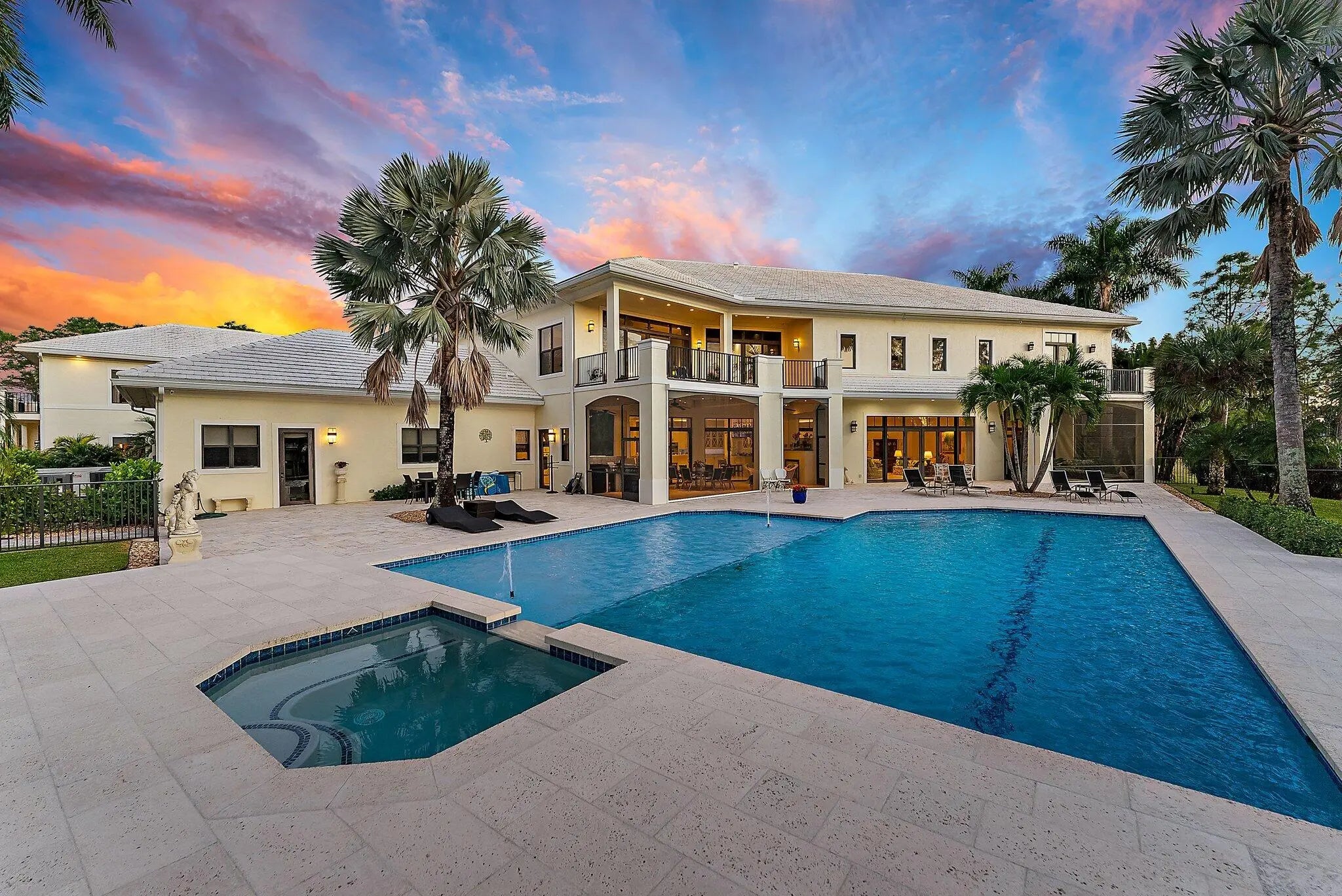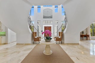 **JUPITER'S PREMIER RANCH ESTATE** Sited on 7.6 Acres of verdant grounds, this grand residence 'Eagle's Nest', has been meticulously + thoroughly RENOVATED to PERFECTION. A manned guard house welcomes you to RANCH COLONY, a private enclave offering Equestrian trails and 2 nearby Championship golf courses. An Owner's gate +350' driveway lead to the stately 11,402 sq. ft home. A grand entry foyer w/ 28' ceiling is graced by brilliant marble floors and a dramatic double staircase of Brazilian wood. Classic design elements incorporate timeless elegance + modern luxury. The interiors have been finely curated for an elevated living experience, offering a spacious + harmonious floor plan and abundant natural light. The main living areas are grand in size and epitomize tasteful elegance. The huge