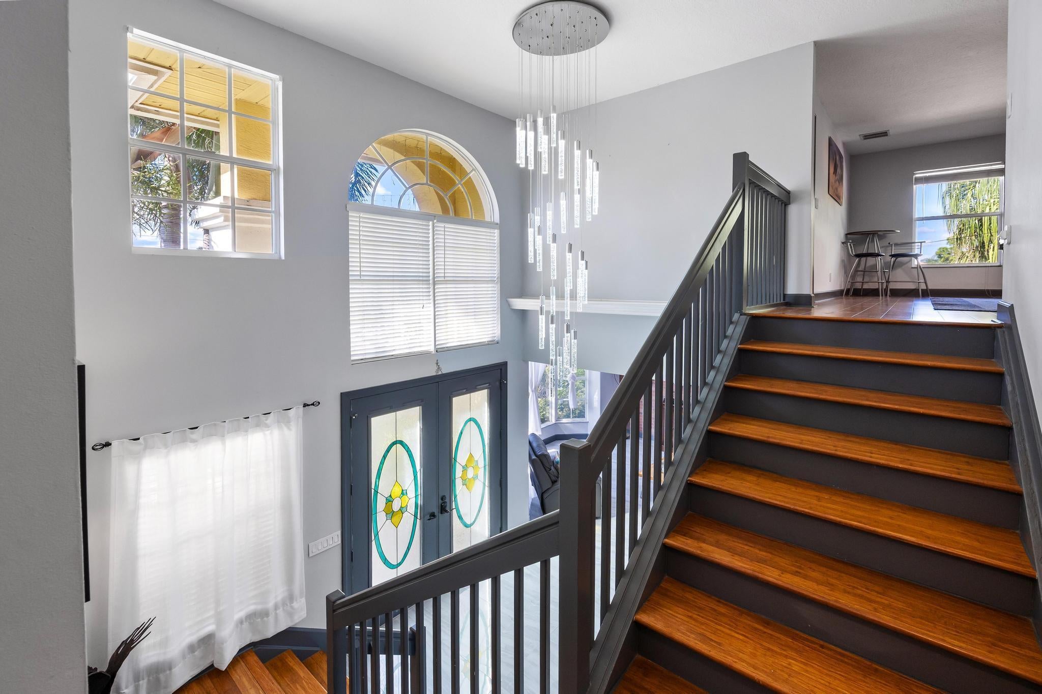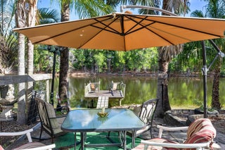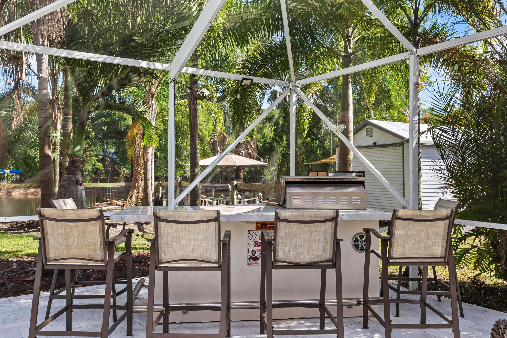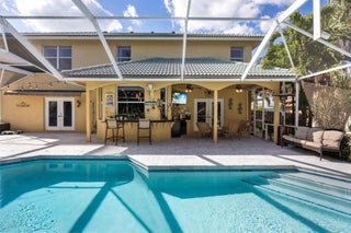 Welcome to an exceptional Majestic Presidential Platinum estate in the highly desirable Paar Estates, set on a 1/2-acre canal-front lot. This impressive 3,500+sq ft two-story CBS home offers refined luxury and generous living spaces. Soaring ceilings, crown molding, and elegant formal living and dining areas create a striking first impression. The gourmet kitchen features quartz countertops, oversized cabinetry, and a stone backsplash, opening to the main living area and an expanded breakfast nook with stunning pool and canal views. A private first-floor in-law suite with patio access provides added versatility. Upstairs, the spacious primary suite includes bamboo flooring and three closets. Enjoy over 1,500 sq ft of screened patio with an oversized pool and refurbished dock on a wide canalperfect for upscale waterfront living and memorable entertaining. This property is enhanced with a brand-new pool water heater, allowing year-round enjoyment, along with a new air conditioning system for maximum comfort. Marble flooring elevates both the pool area and driveway, adding a refined touch to the exterior spaces. Ideally located near hospitals, shopping centers, top-rated schools, and supermarkets, the home also offers exceptional flexibility, boats, RVs, and trailers are welcome with no restrictions, making it perfect for those seeking luxury, convenience, and freedom in one exceptional residence.