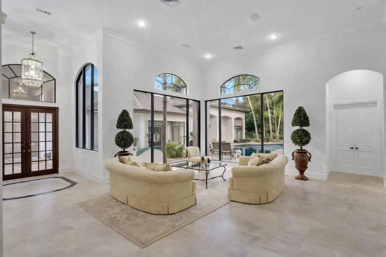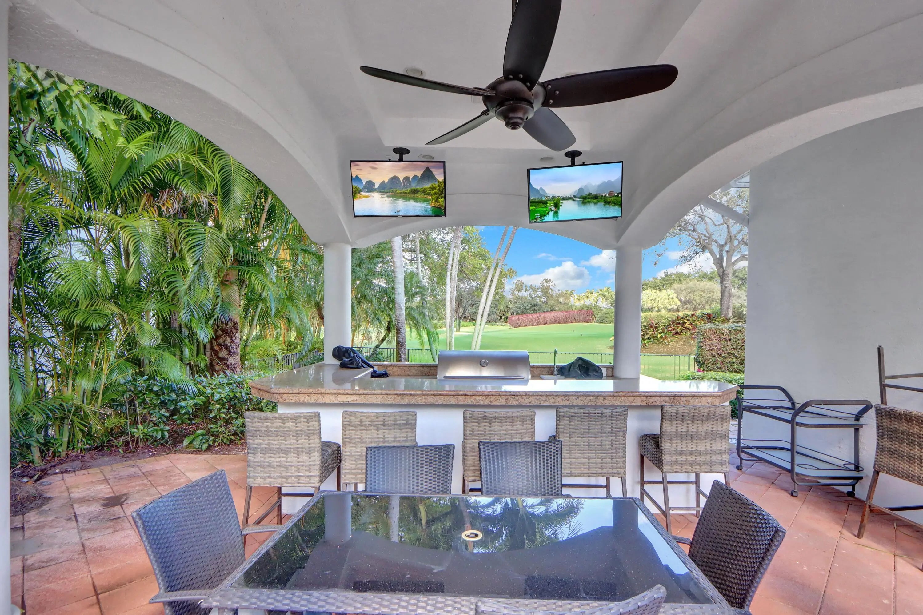 GOLF MEMBERSHIP RENTAL! Available April-September 2026, this elegant off-season furnished/turnkey home offers refined living in a one-story courtyard home nestled on the golf course. Featuring 5 bedrooms, 61/2 baths, an office, 8-seat media room, and 4-car garage, the residence is filled with natural light and enhanced by volume ceilings, Saturnia marble floors, wood-grain porcelain tile in the primary suite, hardwood and carpet in the secondary bedrooms. Other features include decorative columns, plantation shutters, 2 laundry rooms, accordion hurricane shutters. The expansive courtyard is ideal for entertaining with plenty of lounge space, a freeform pool, gazebo with grill and TVs. A 6-seat golf cart is available for your use. Call today to secure this exceptional off-season opportunity.
