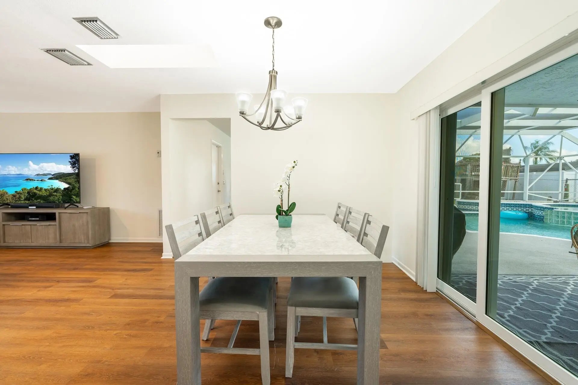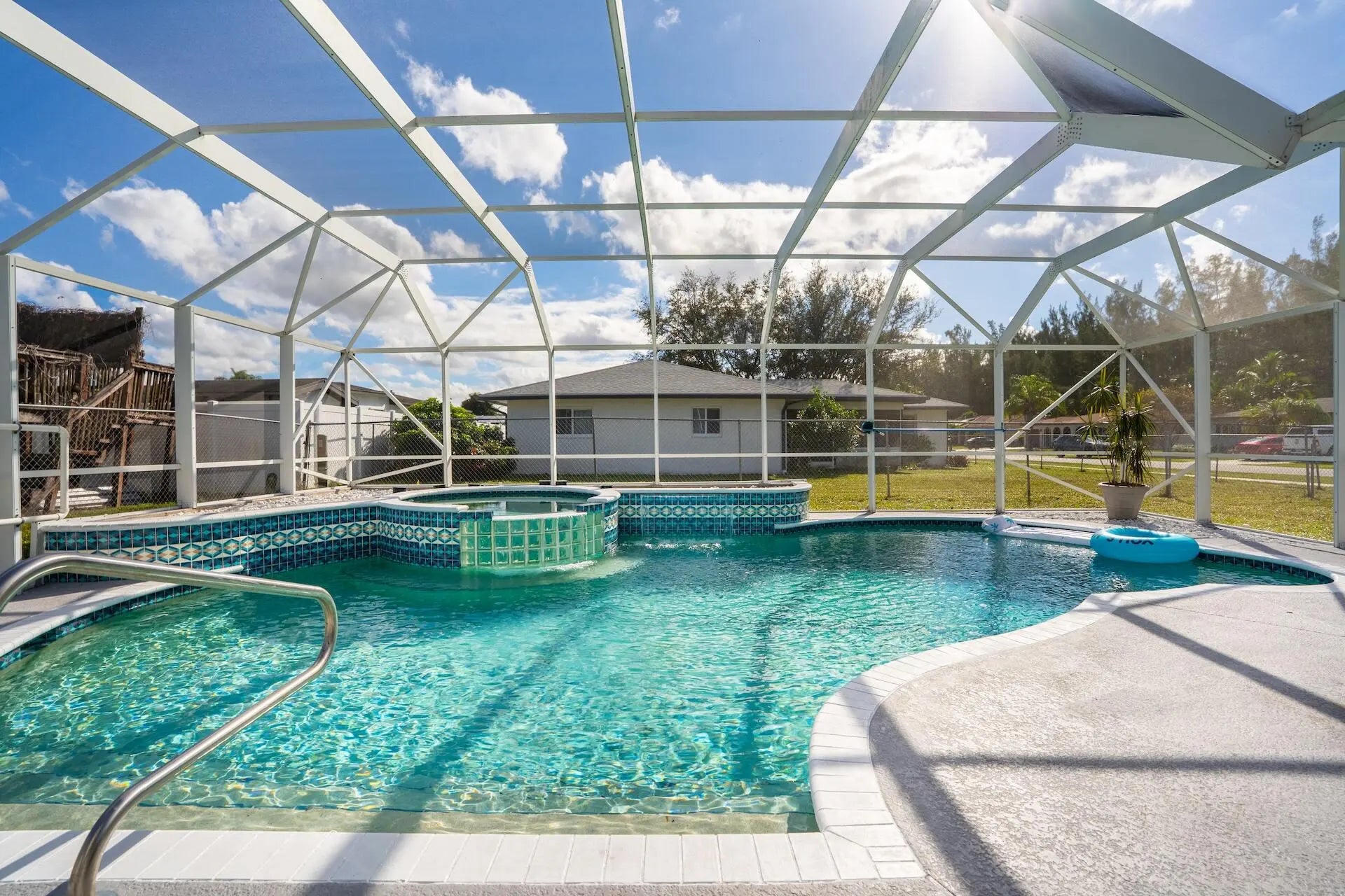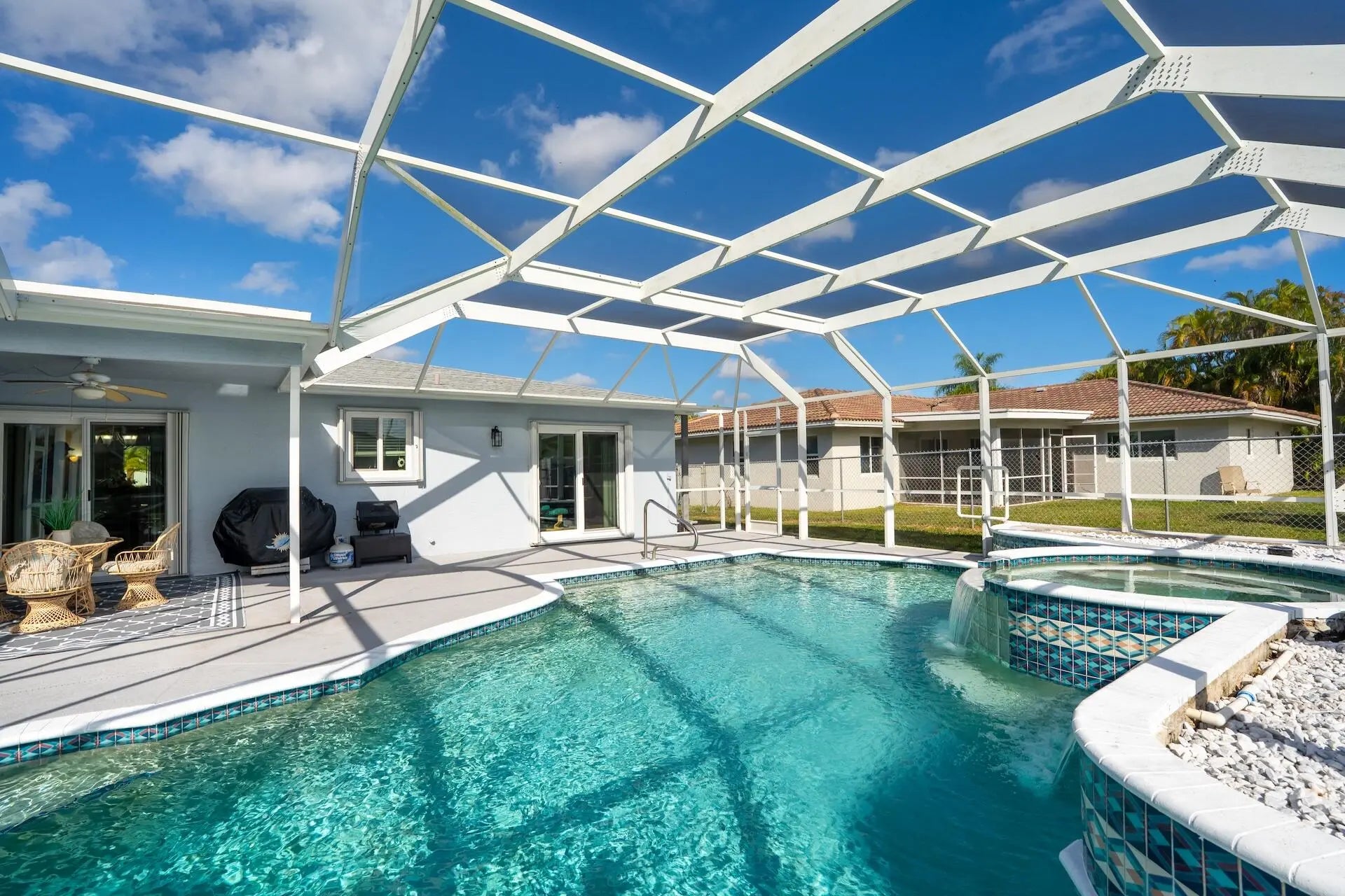 Beautiful and inviting 3-bedroom, 2-bath home with a 2-car garage, located in desirable Palmetto Pines of Boca Raton. Situated on an oversized corner lot, this home features a large screened-in heated pool & spa, perfect for year-round outdoor living. Complete hurricane-impact windows and a new roof, both completed in 2024. The primary suite boasts a walk-in closet and a beautifully renovated bathroom with direct access to the pool area. Luxury vinyl flooring throughout the home while custom lighting and skylights enhance the living spaces with abundant natural light. The spacious eat-in kitchen includes a breakfast area ideal for casual dining & entertaining. A-rated school district and just minutes from Boca's premier shopping, dining, & amenities. Low HOA of only $41.67 p/month.