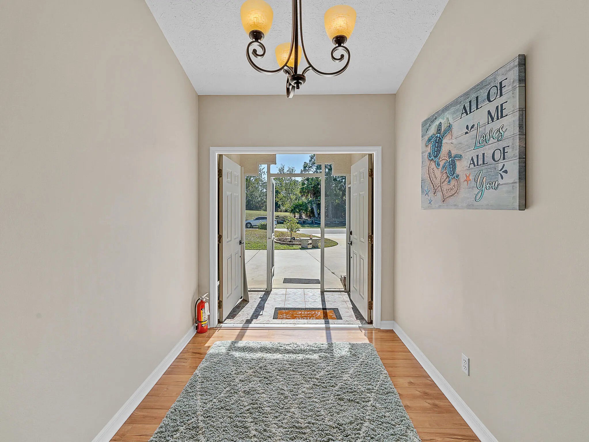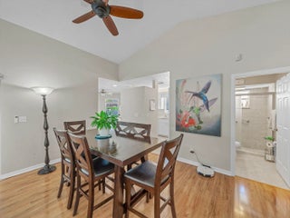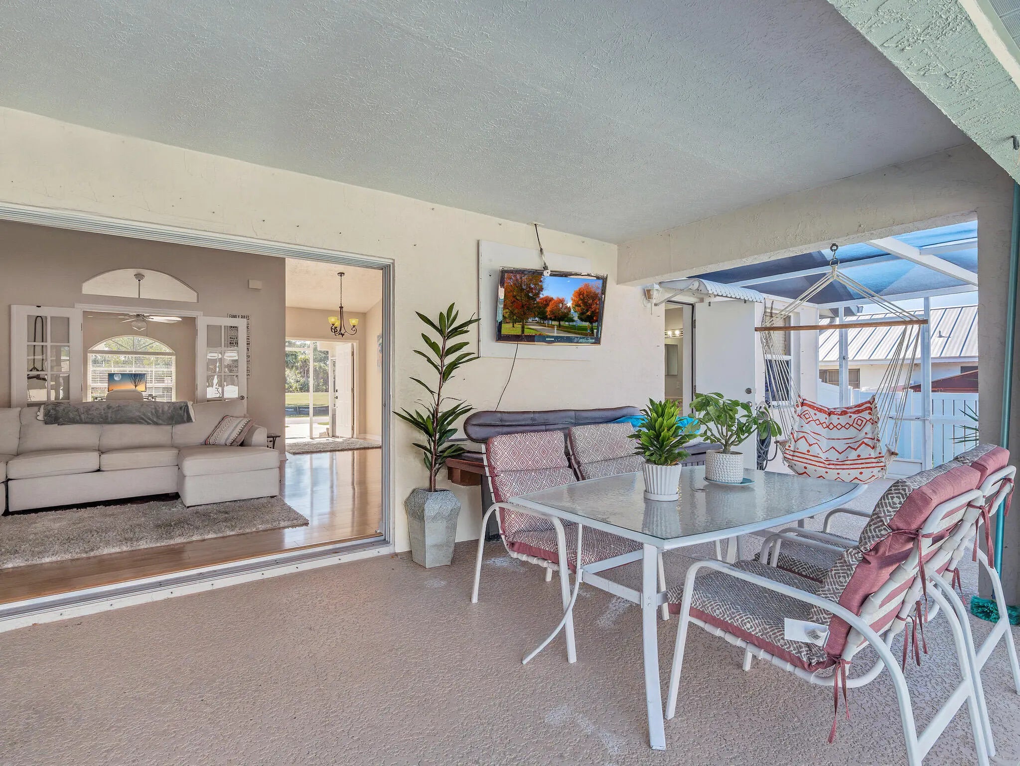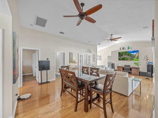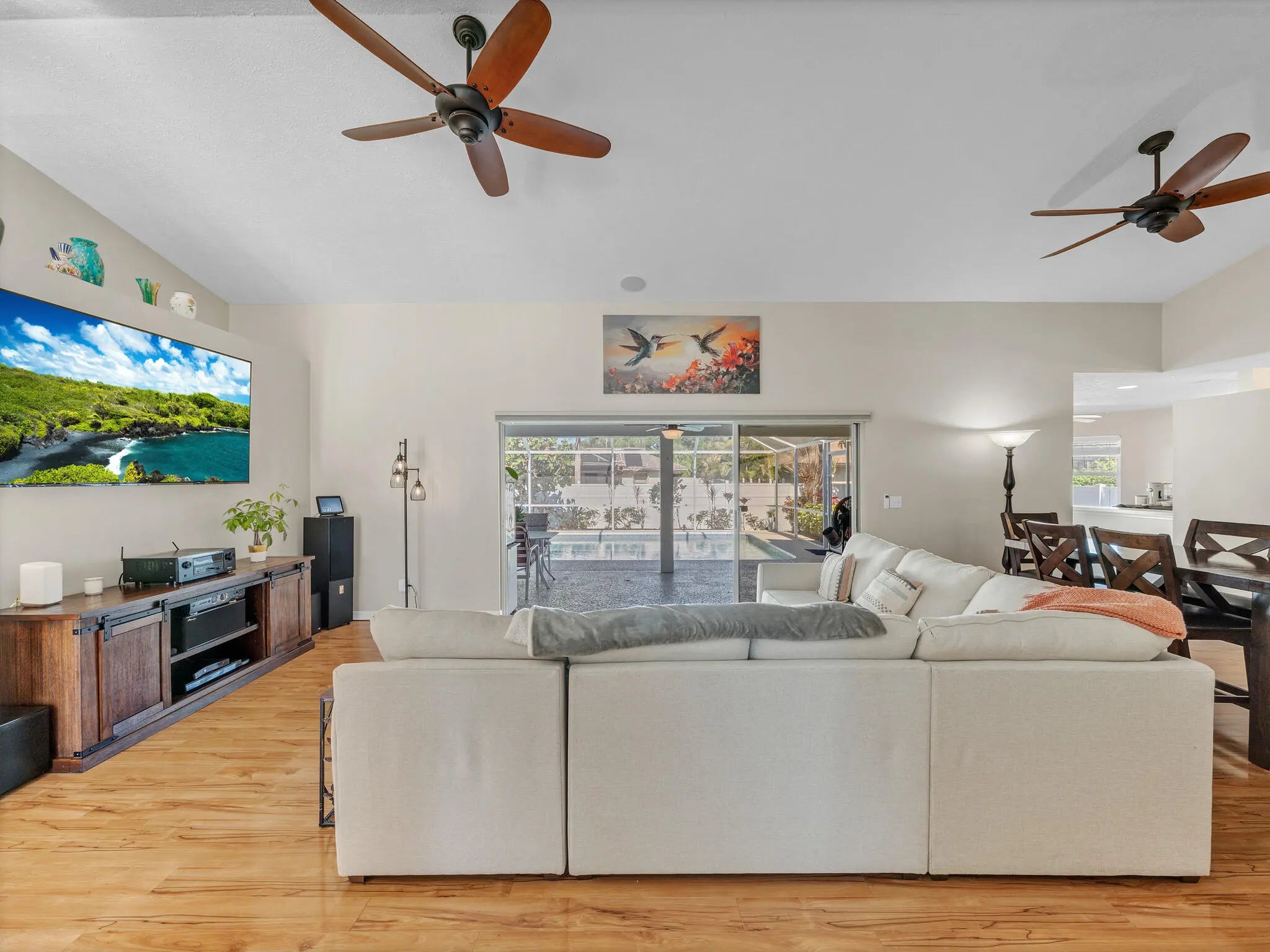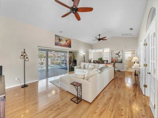 Welcome home to this Sandpiper Bay residence built in 1994 with solid CBS construction. This well-maintained 3-bedroom, 2-bath, 2-car garage home offers 1,591 sqft of living space with a functional split-bedroom layout designed for comfort and privacy. The property offers attractive curb appeal with mature landscaping and a hummingbird garden. Double French front doors lead into the open great room featuring a vaulted ceiling, custom fans, laminate wood-look flooring, and large 3-panel pocket sliding glass doors leading to the expansive screened lanai, creating a seamless indoor-outdoor living area. The kitchen features a galley-style layout with a breakfast nook and French doors leading to the lanai and 12'' x 24'' porcelain tile laid on the diagonal in select areas. All newer GE