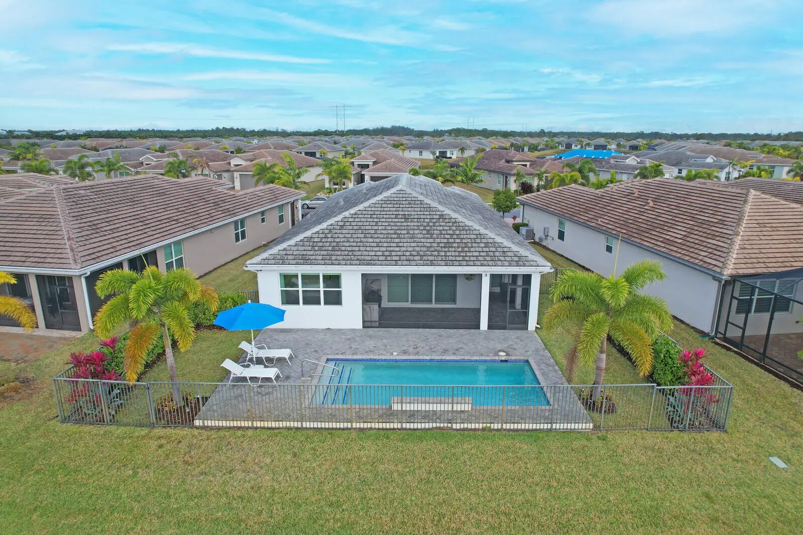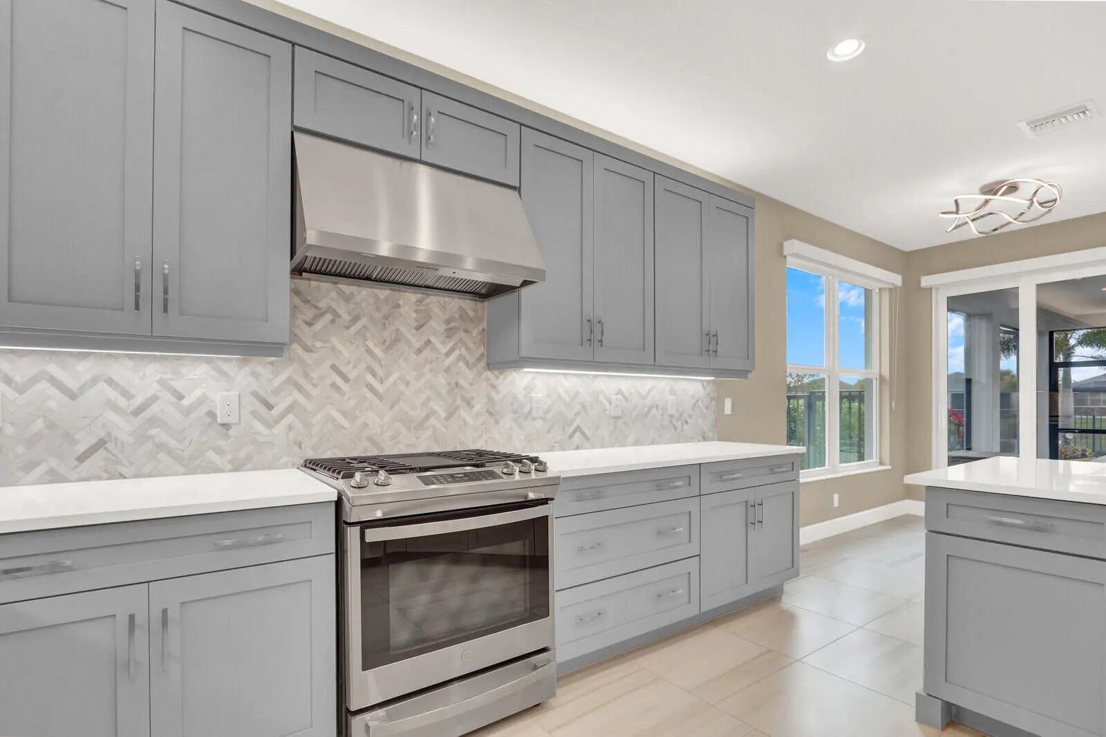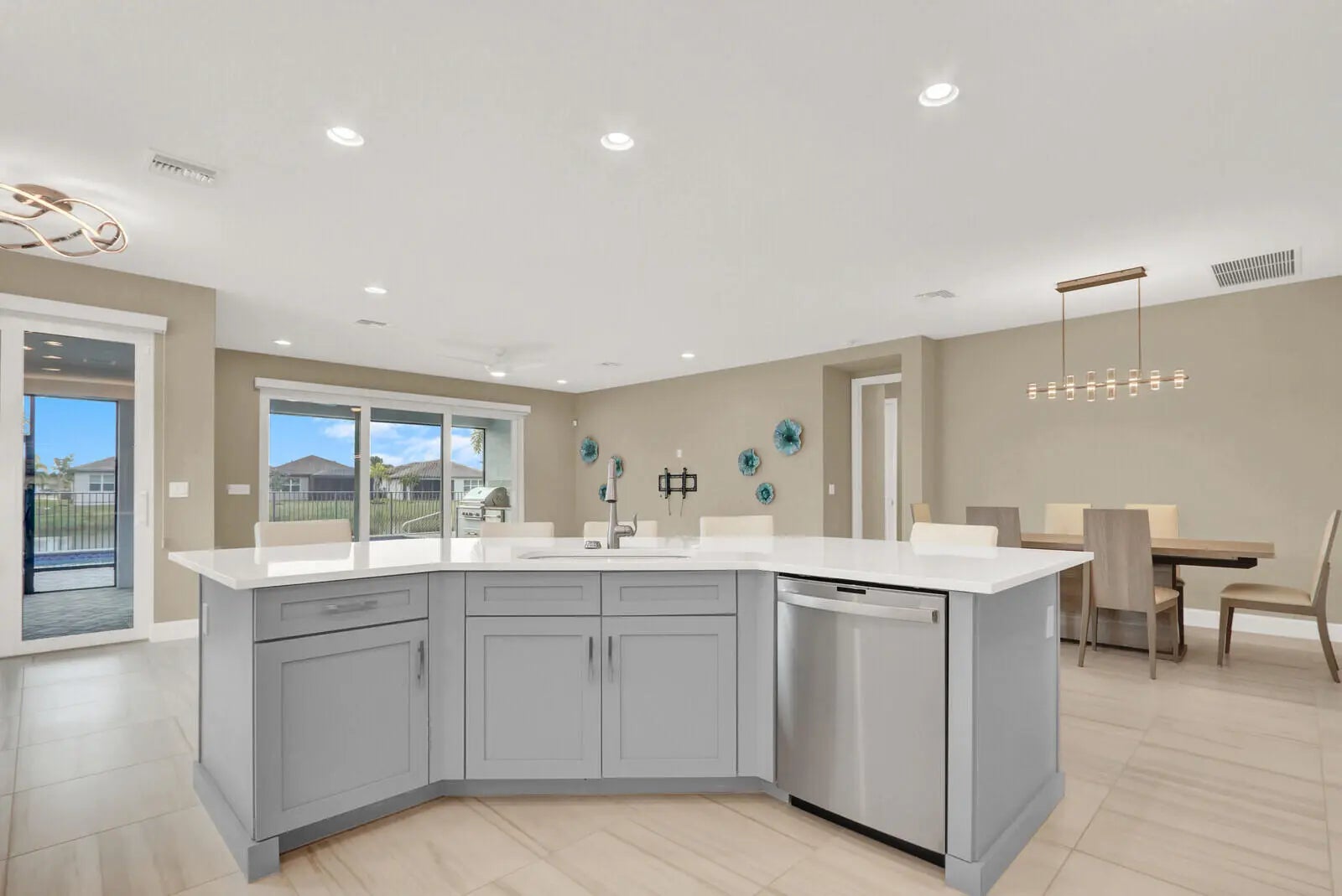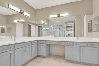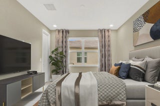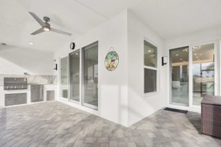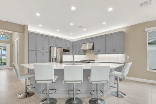 This Luxury Bimini Model is a 3-bedroom, 3-bath home with a den (optional 4th bedroom) on a desirable lakefront lot. The home features a gourmet kitchen with quartz countertops, marble backsplash, upgraded cabinetry and flooring, and pantry pull-outs. Enjoy a private heated swimming pool, fenced yard, and an outdoor kitchen complete with a gas BBQ, hot/cold water, and a refrigerator. Additional highlights include whole-house water filtration, custom closets, Hunter Douglas window treatments, upscale lighting, and an included dining room set and bar stools.Valencia Grove is an active, resort-style community for over-55s. Amenities include a clubhouse, restaurant/bar, multiple pools, fitness center, exercise classes, pickleball, cultural center, community gardens, and more--virtually