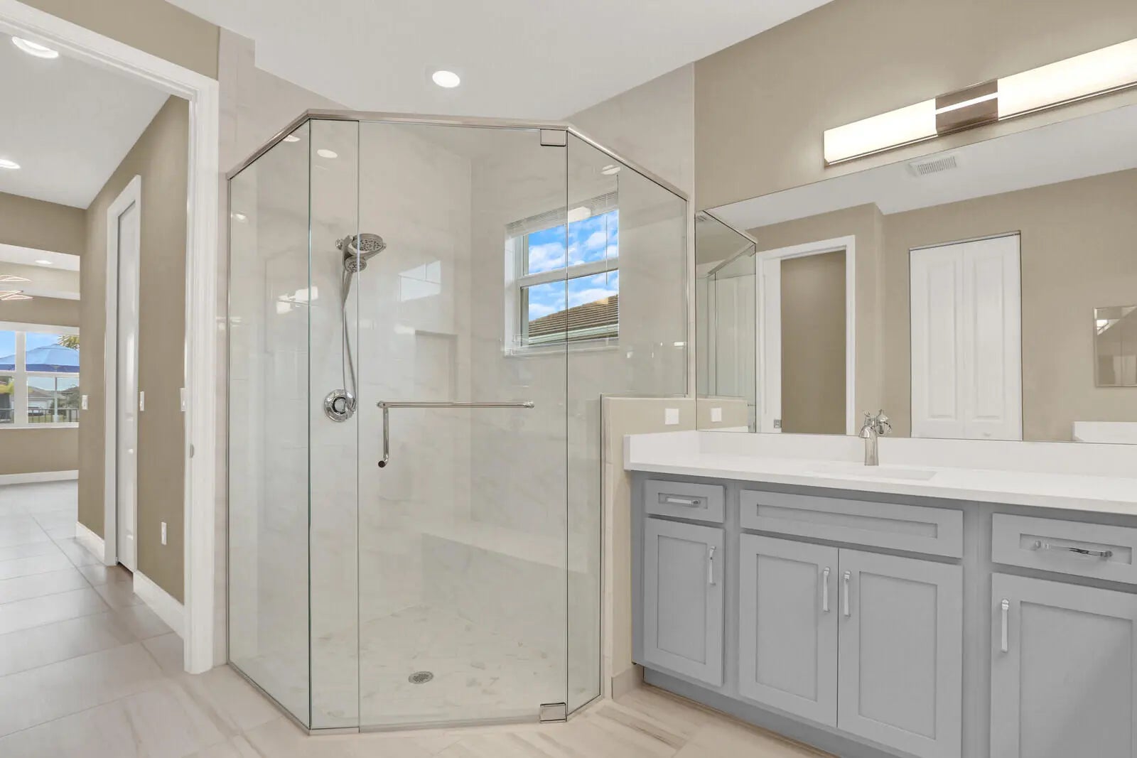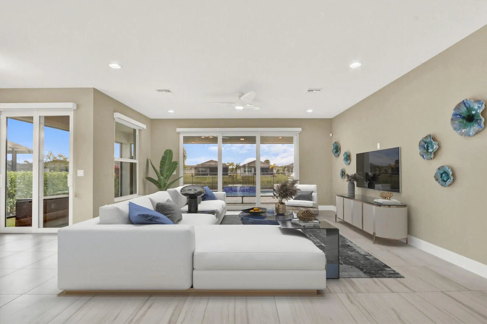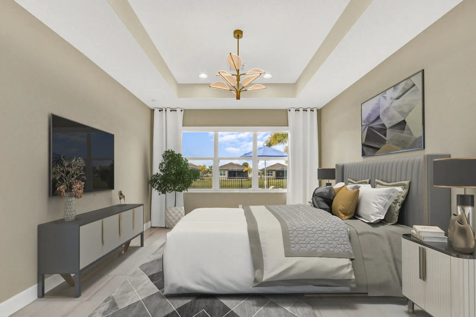 This Luxury Bimini Model is a 3-bedroom, 3-bath home with a den (optional 4th bedroom) on a desirable lakefront lot. The home features a gourmet kitchen with quartz countertops, marble backsplash, upgraded cabinetry and flooring, and pantry pull-outs. Enjoy a private heated swimming pool, fenced yard, and an outdoor kitchen complete with a gas BBQ, hot/cold water, and a refrigerator. Additional highlights include whole-house water filtration, custom closets, Hunter Douglas window treatments, upscale lighting, and an included dining room set and bar stools.Valencia Grove is an active, resort-style community for over-55s. Amenities include a clubhouse, restaurant/bar, multiple pools, fitness center, exercise classes, pickleball, cultural center, community gardens, and more--virtually