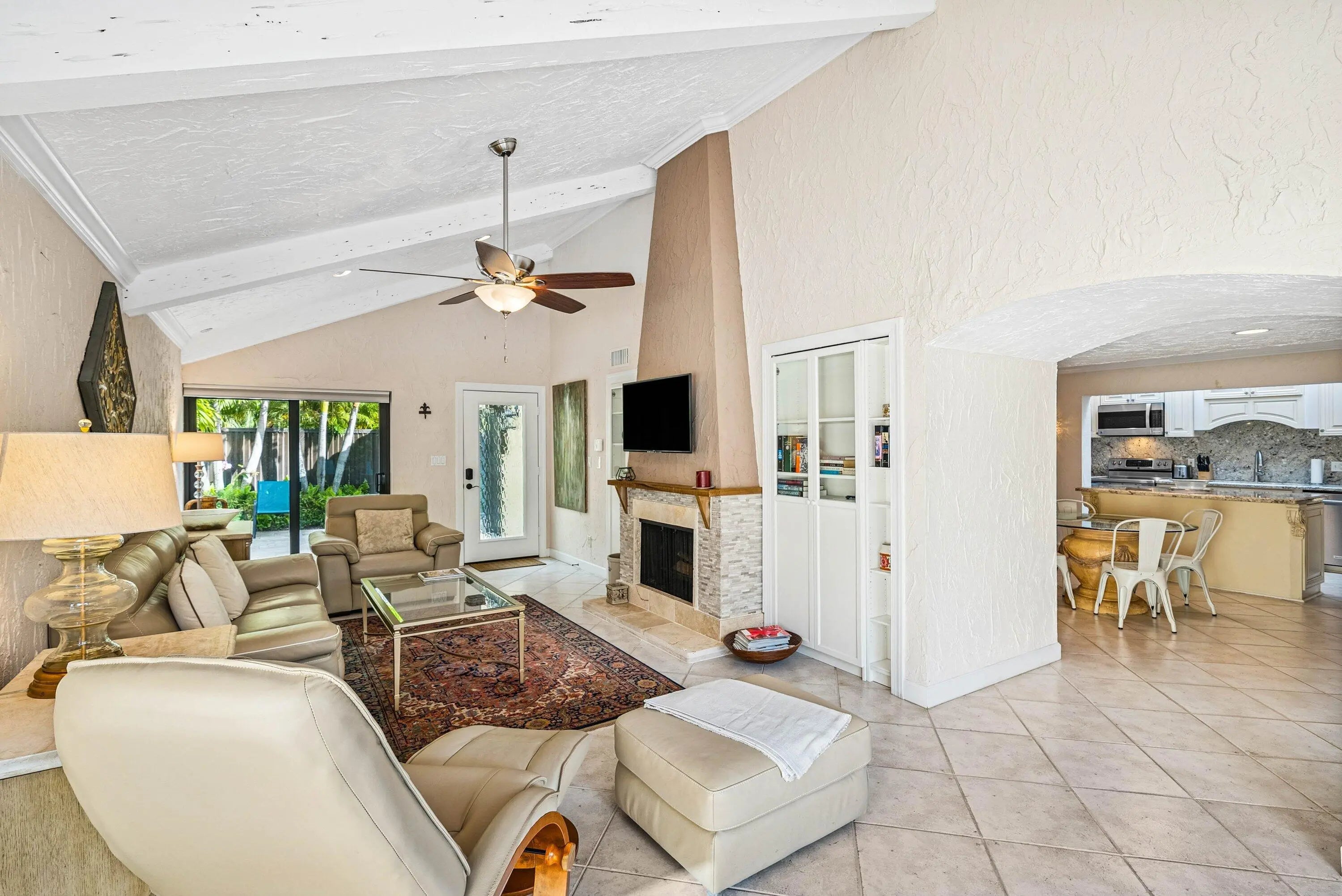 Welcome to this fully furnished Mediterranean retreat. This custom renovated 3-bedroom, 2-bath villa lives like a single-family home, offering rare privacy, a two-car garage, and your own private saltwater pool. Thoughtfully upgraded with a newer roof, impact sliders, and new 2023 A/C and water heater, the home features a spacious living room with a wood-burning fireplace, open kitchen with stainless steel appliances and granite countertops, and a generous dining area. Step outside to an inviting outdoor oasis with a salt water pool, custom lighting, new pool pump, travertine pavers, and multiple patio spaces perfect for entertaining or relaxing.Nestled in an intimate 21 home community with low HOA fees,