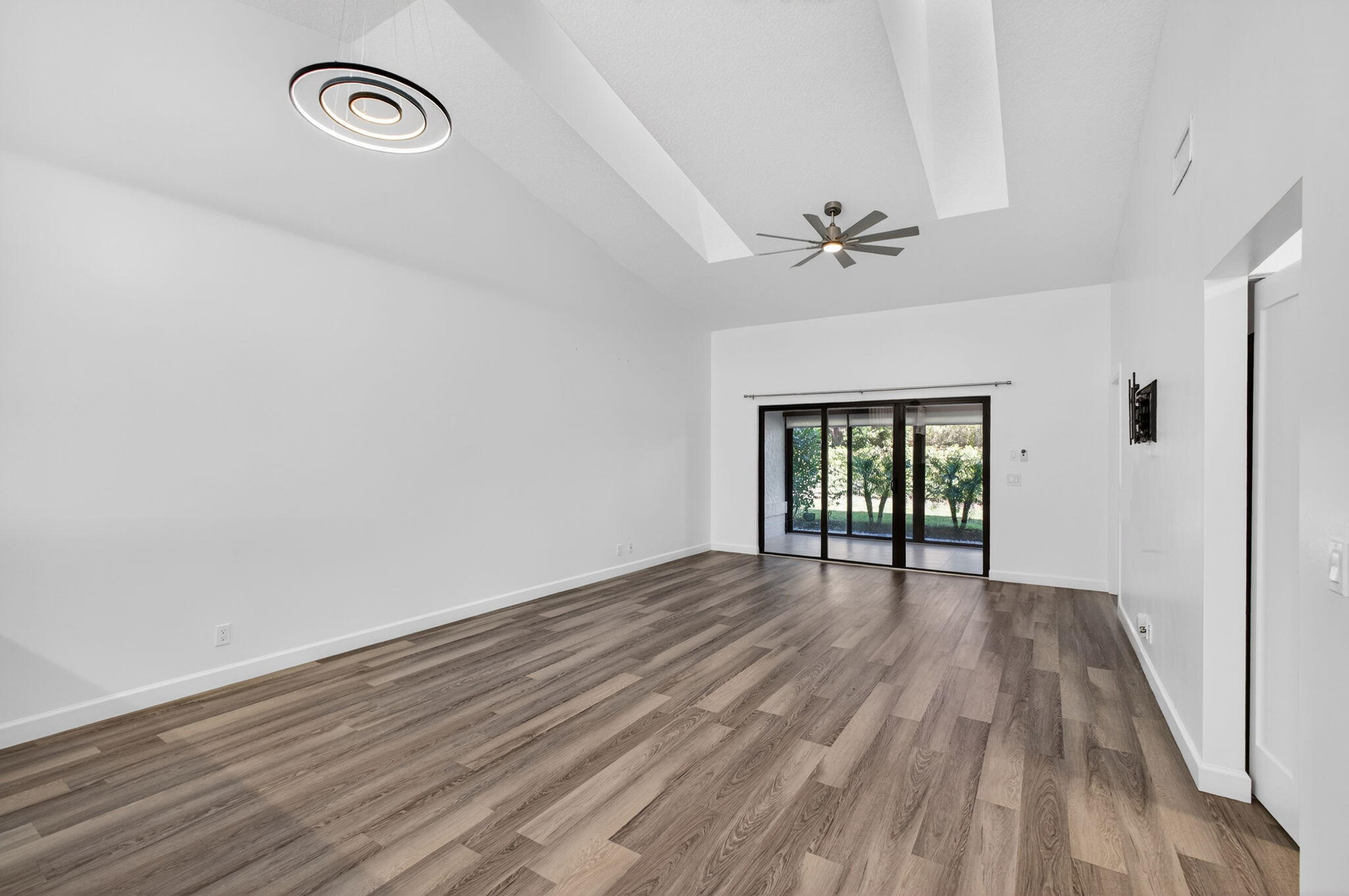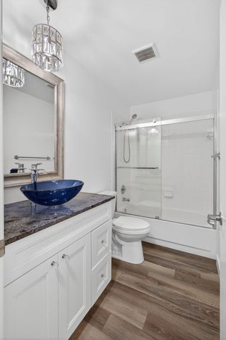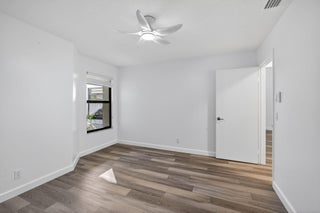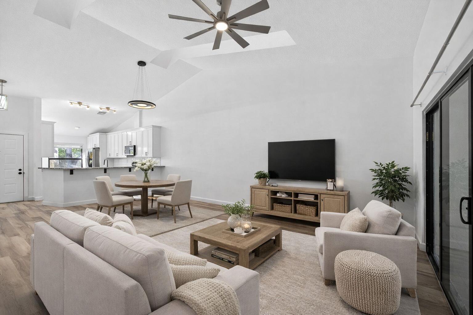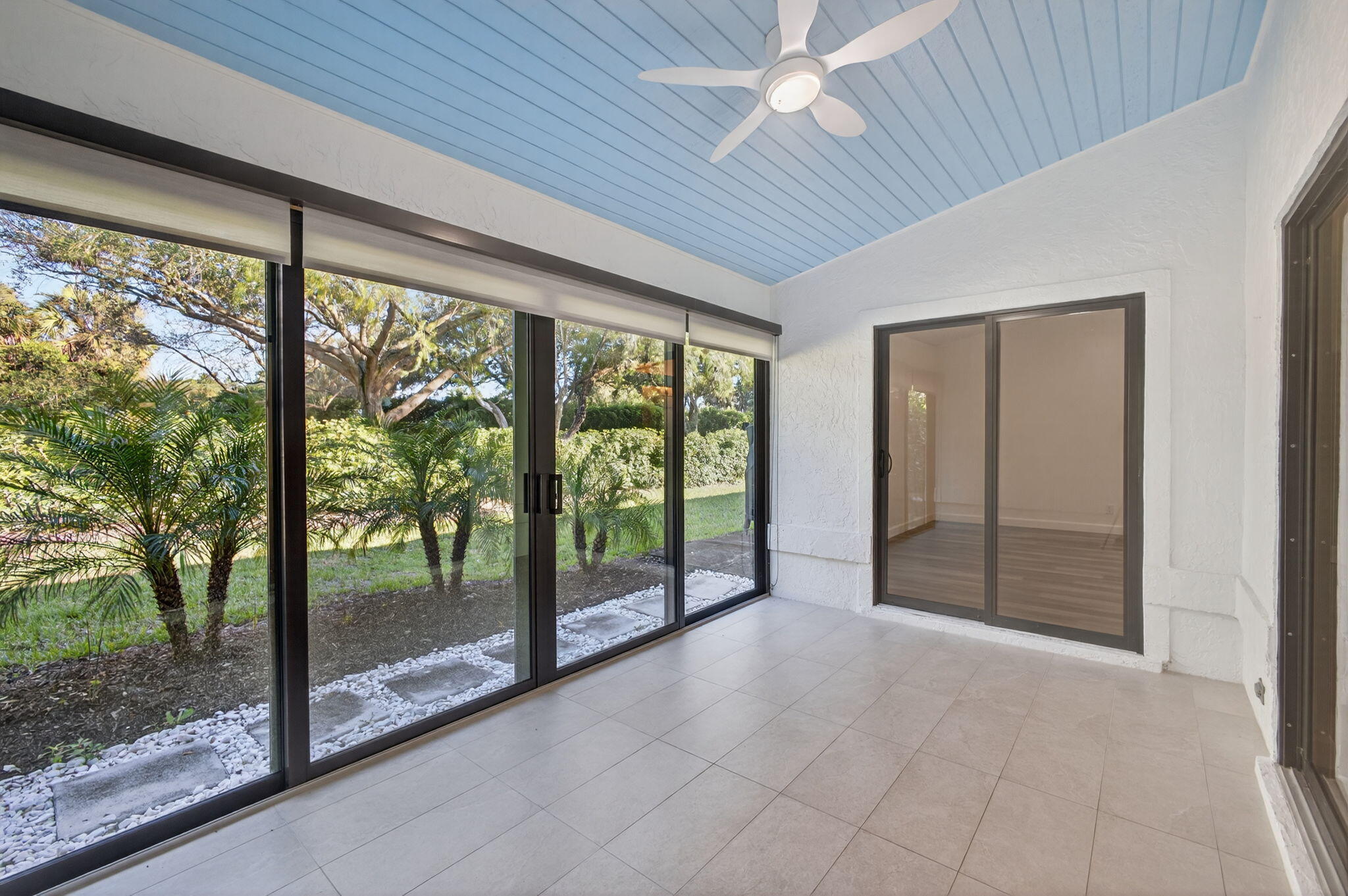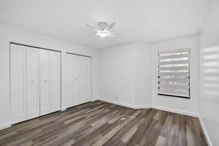 An unexpected delight! This stunning single-level, fully renovated townhouse offers a spacious layout with 2 bedrooms, 2 bathrooms, and a single-car garage featuring a brand-new door. Enjoy a brightly enclosed sunroom with hurricane-impact sliding glass doors and windows for peace of mind. Every detail has been thoughtfully updated - the home includes a newer AC system with added UV light system for cleaner air, custom blinds throughout, new microwave and refrigerator, updated doors, new washer and dryer, and upgraded plumbing. Custom closets with a remote-controlled Hunter Douglas retractable solar shade for the skylight add an elegant touch. This home is in pristine, move-in-ready condition--just bring your toothbrush! Roof assessment negotiable (new July 2025). A must-see property!