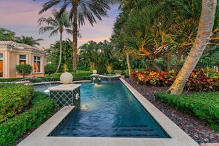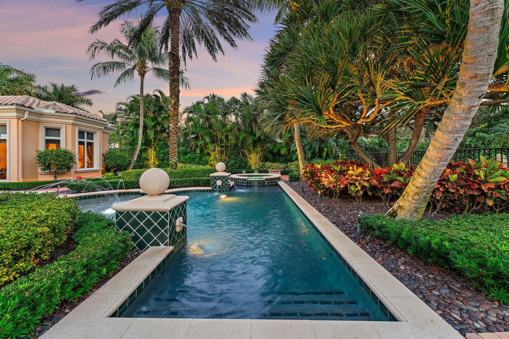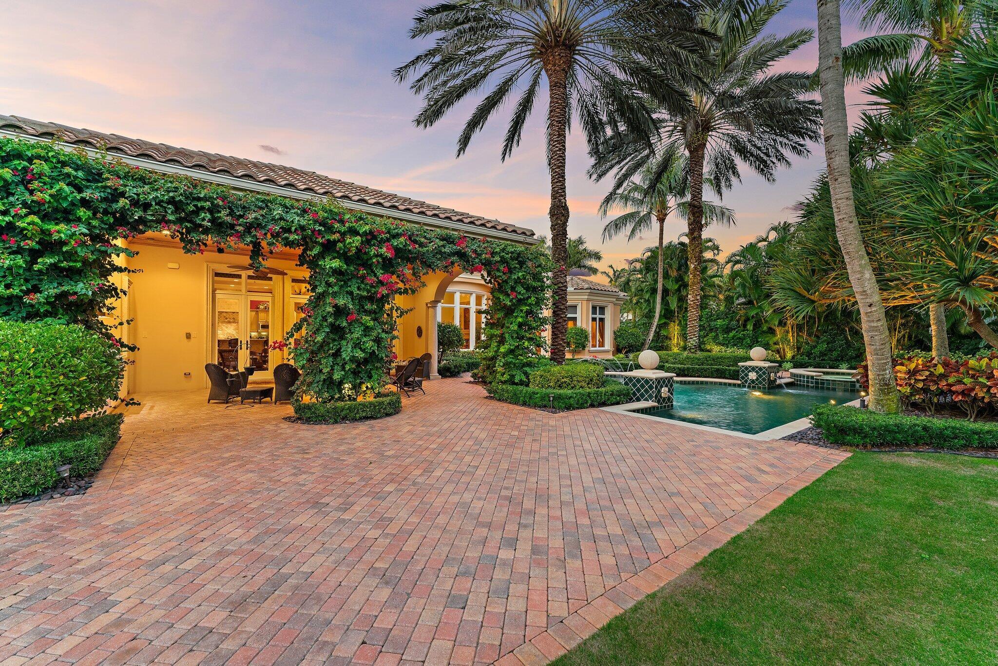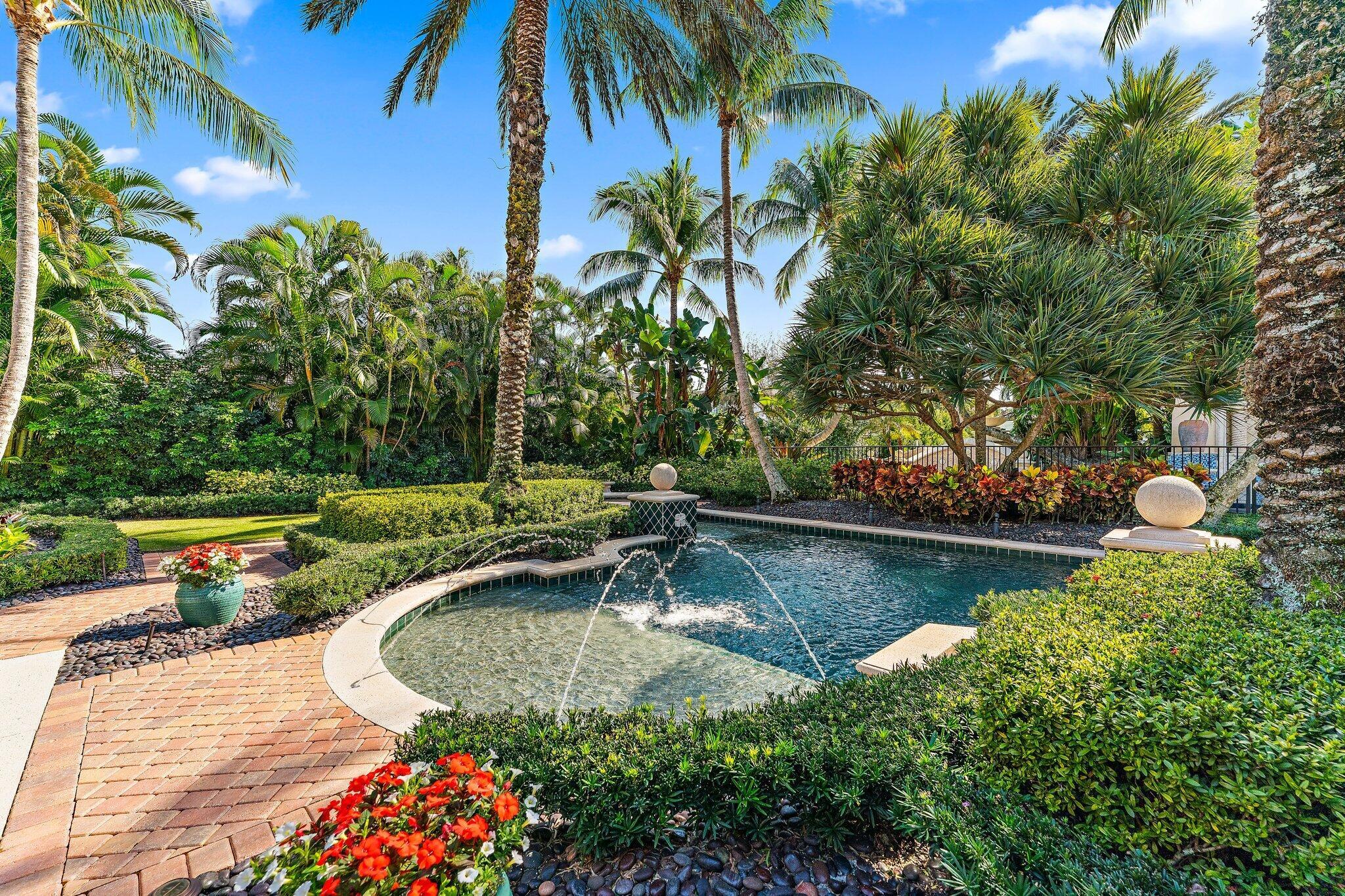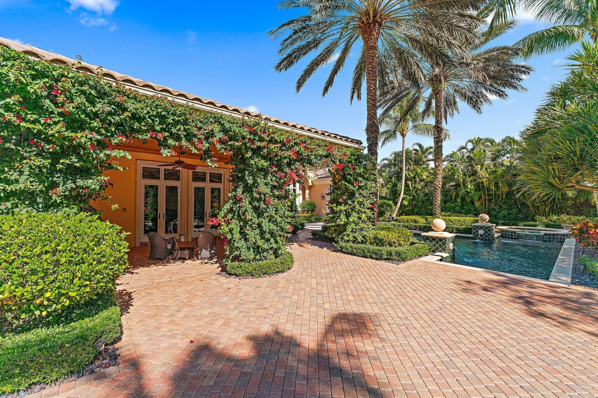 Positioned on an expansive, meticulously landscaped nearly half-acre lot in the Grand Estates section of Old Palm, 11756 Elina Court delivers exceptional privacy, elegance, and resort-style outdoor living. Surrounded by mature palms, hibiscus trees, and lush tropical greenery, this residence offers a breathtaking backyard oasis that feels like a private luxury retreat. One of the rare homes in the community where club membership is optional and not required. With almost 5,000 sq. ft. of refined living space, this 4-bedroom, 4.5-bath home plus library features a tri-split floor plan designed for both grand entertaining and serene everyday living. A graceful double-door entry opens to soaring ceilings, elegant architectural details, and a sprawling layout filled with natural light.At the heart of the home is a true chef's kitchen, complete with an oversized island, new Wolf double ovens, gas range, prep sink, long breakfast bar, and an integrated office nook. A casual dining area overlooks the lush backyard, offering the perfect setting for morning coffee with a view. The super-spacious primary suite is positioned to capture serene pool views and features dual walk-in closets and a luxurious spa-style bath. Additional interior highlights include a sophisticated library with stunning bay windows, a grand formal entry, and a living room anchored by a beautiful statement fireplace, creating a warm and inviting centerpiece, with a seamless flow between the living spaces. The backyard is a showpiece, an extraordinary outdoor sanctuary featuring a resort-style pool with spa, waterfalls, and upgraded digital lighting and controls, plus a brand-new pool heater. Expansive lounging and dining areas sit among meticulously designed landscaping for maximum privacy and beauty. A beautifully designed private side courtyard adds a second outdoor living area, with direct access from two guest suites and the family room, ideal for quiet relaxation or a secluded spot to unwind. This home is equipped with a full-house generator, integrated Sonos sound system, and a premium Sony television that conveys. The garage has been elevated with epoxy flooring, custom built-in storage cabinetry, and an air-conditioned storage room for all your extras. Newly re-stained garage doors add to the home's impeccable curb appeal. This stunning property stands as a beautifully maintained estate, showcasing exceptional care and timeless details in an exclusive gated and secure setting within Old Palm Golf Club.