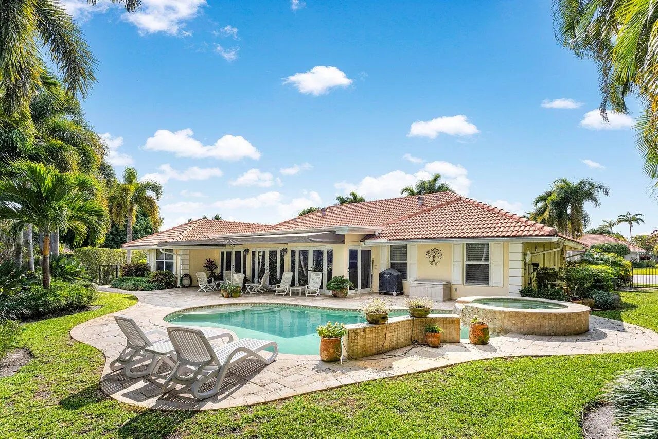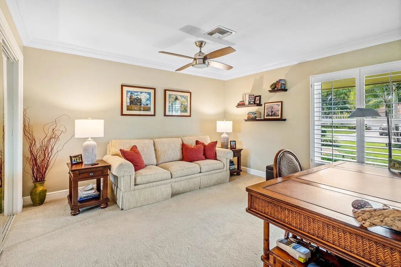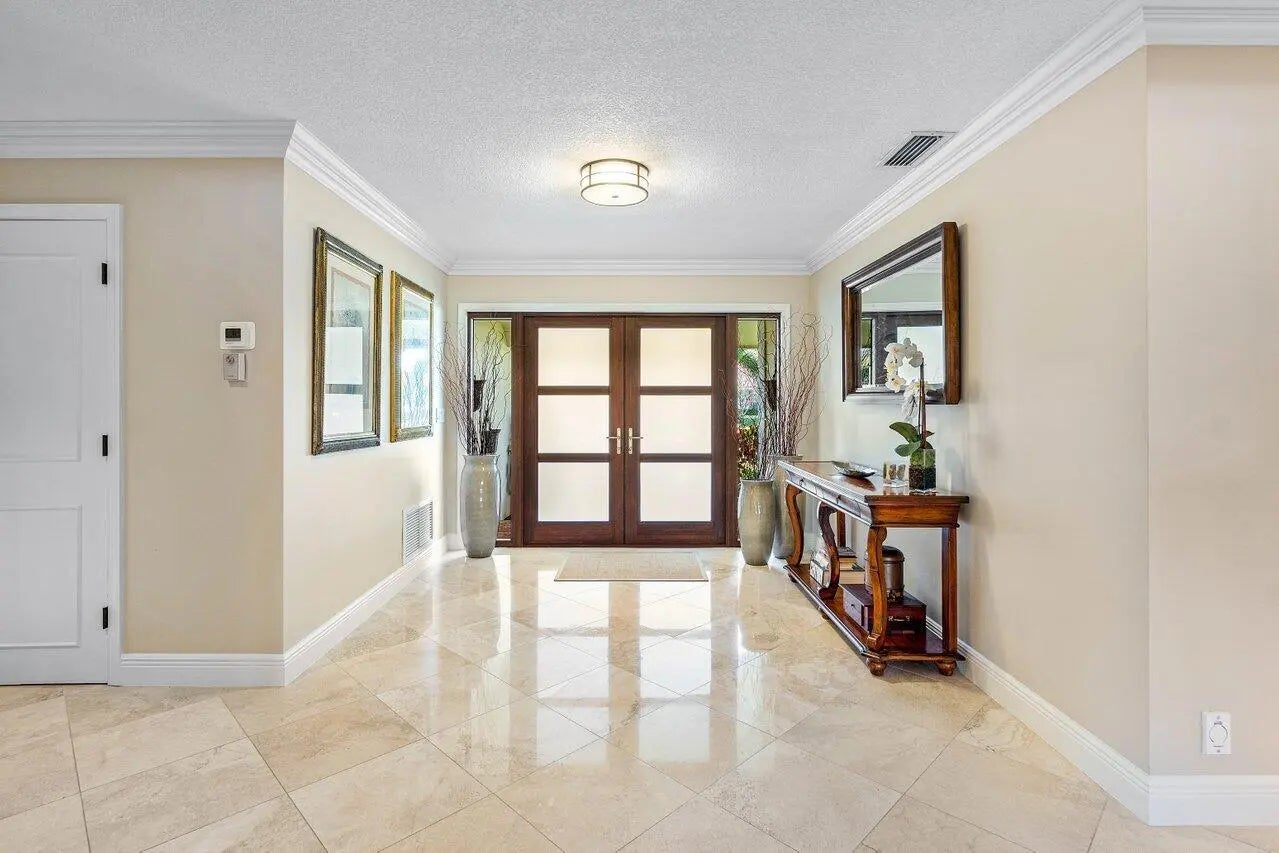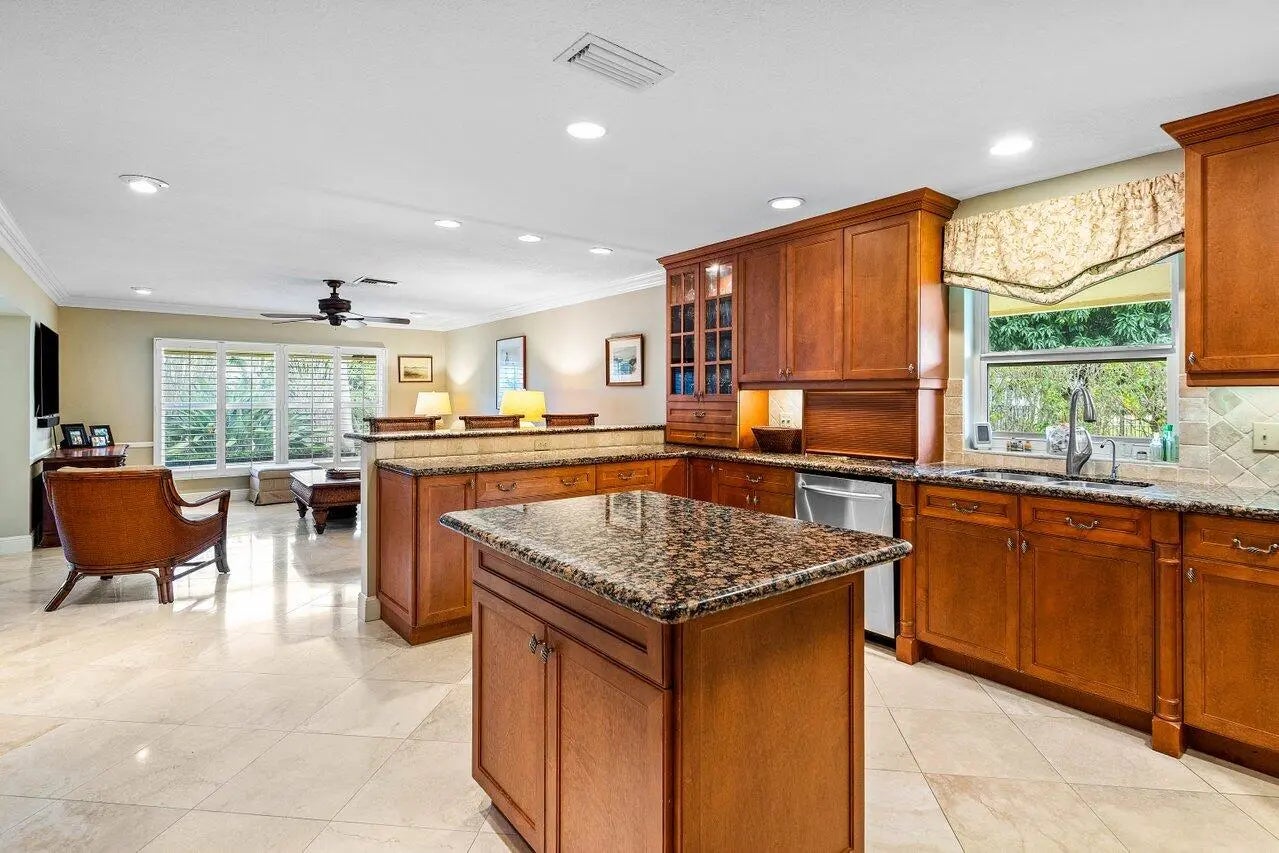 Privately positioned on a quiet cul-de-sac within Delray Dunes Golf & Country Club, this lakefront 3-bedroom, 2.5-bath residence blends timeless elegance, warmth, and effortless Florida living. A double glass impact-door entry welcomes you into an inviting foyer that flows seamlessly into spacious living areas adorned with travertine flooring and crown molding throughout. Designed for both comfortable everyday living and gracious entertaining, the home features formal living room and dining area along with thoughtfully curated gathering spaces. The well-appointed kitchen offers abundant cabinetry, a center island, breakfast bar, wall oven with separate range, and a convenient workstation desk, all opening naturally to the family room for easy connectivity. The Florida room is enhanced by