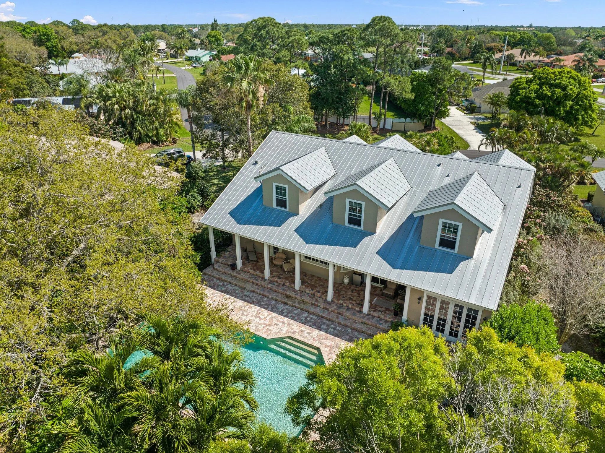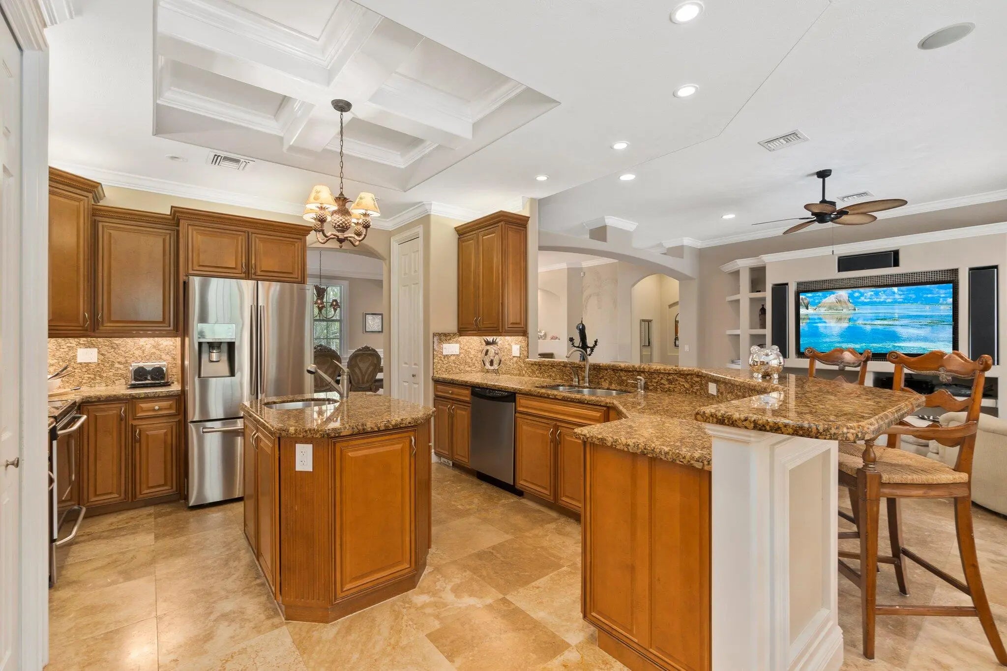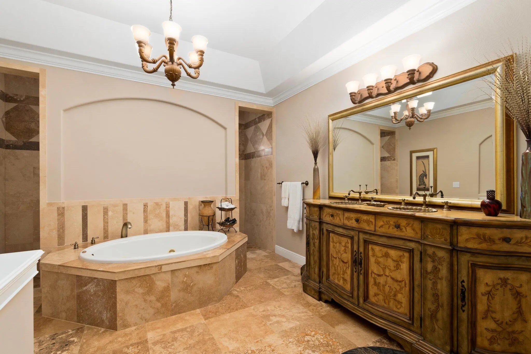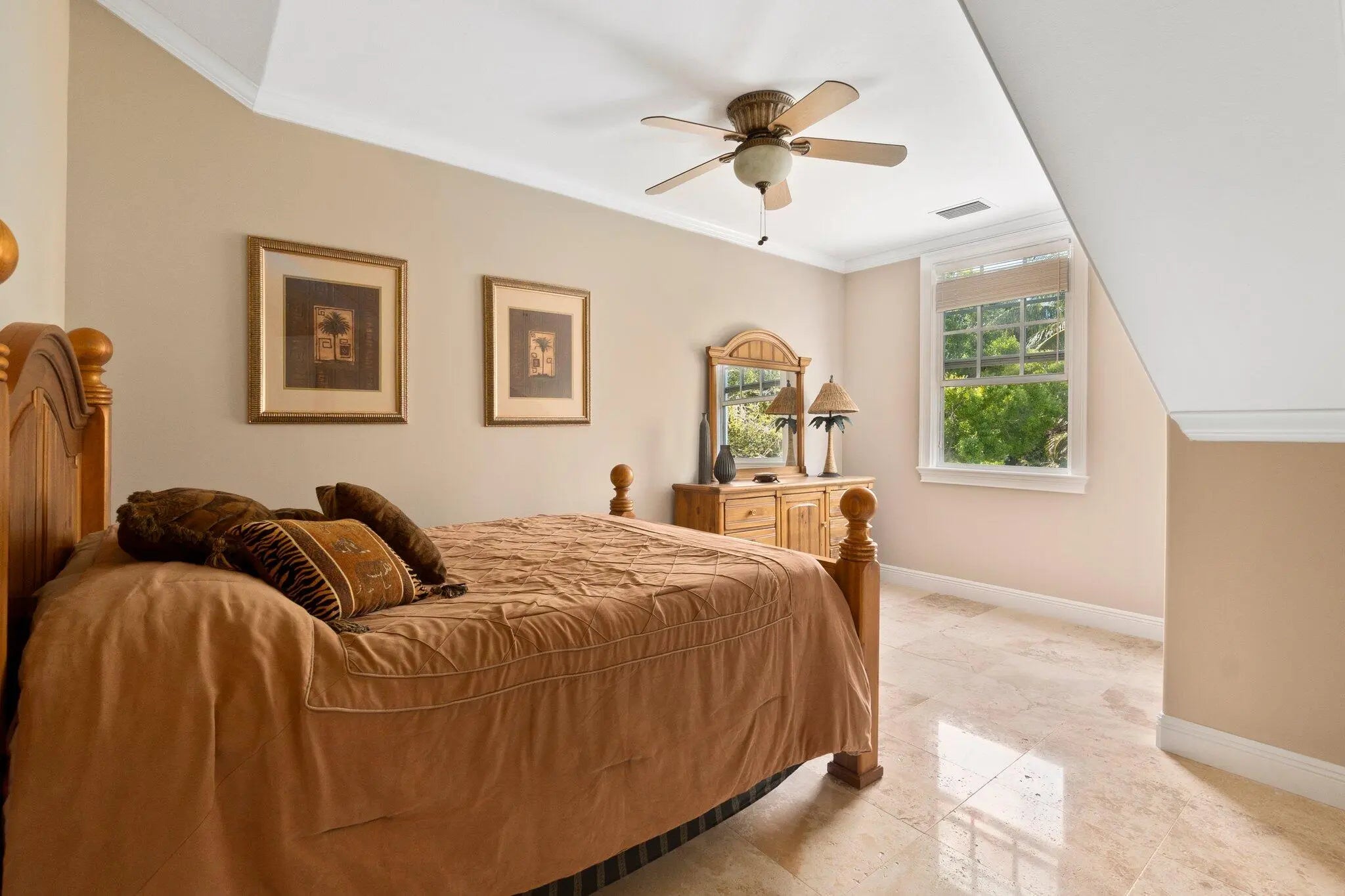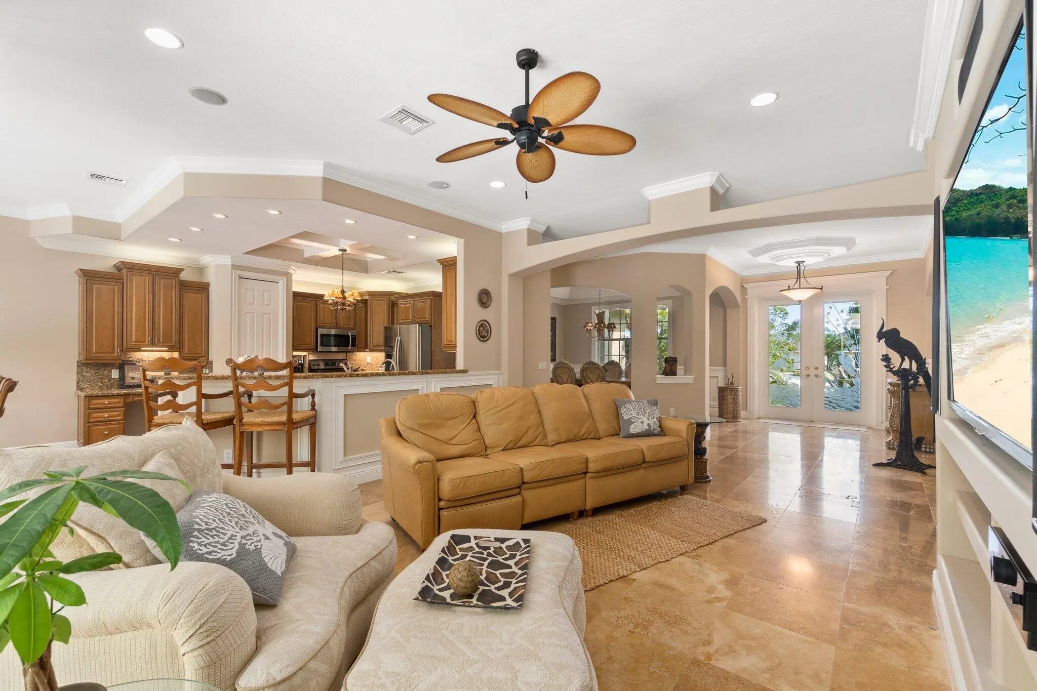 The crown jewel of Sandpiper Bay on .68 acres backing Howard's Creek! This luxury estate with 5 bedrooms plus office/den and 4.5 bathrooms showcases solid construction and elegant design, featuring a gourmet kitchen with center island, breakfast bar, built-in desk, formal dining room, spacious living area, second bedroom, home office, and cabana bath on the main level. Upstairs offers three bedrooms, 2.5 baths, media room with wet bar, family room, and loft--ideal for guests and flexible living. French doors open to a spectacular 44x22 pool and spa, expansive patio, and lush landscaping. Impact windows throughout. Built to exceed code with 10-ft concrete block walls, steel floor joists, steel trusses, and 16-inch on-center construction for exceptional strength and durability.