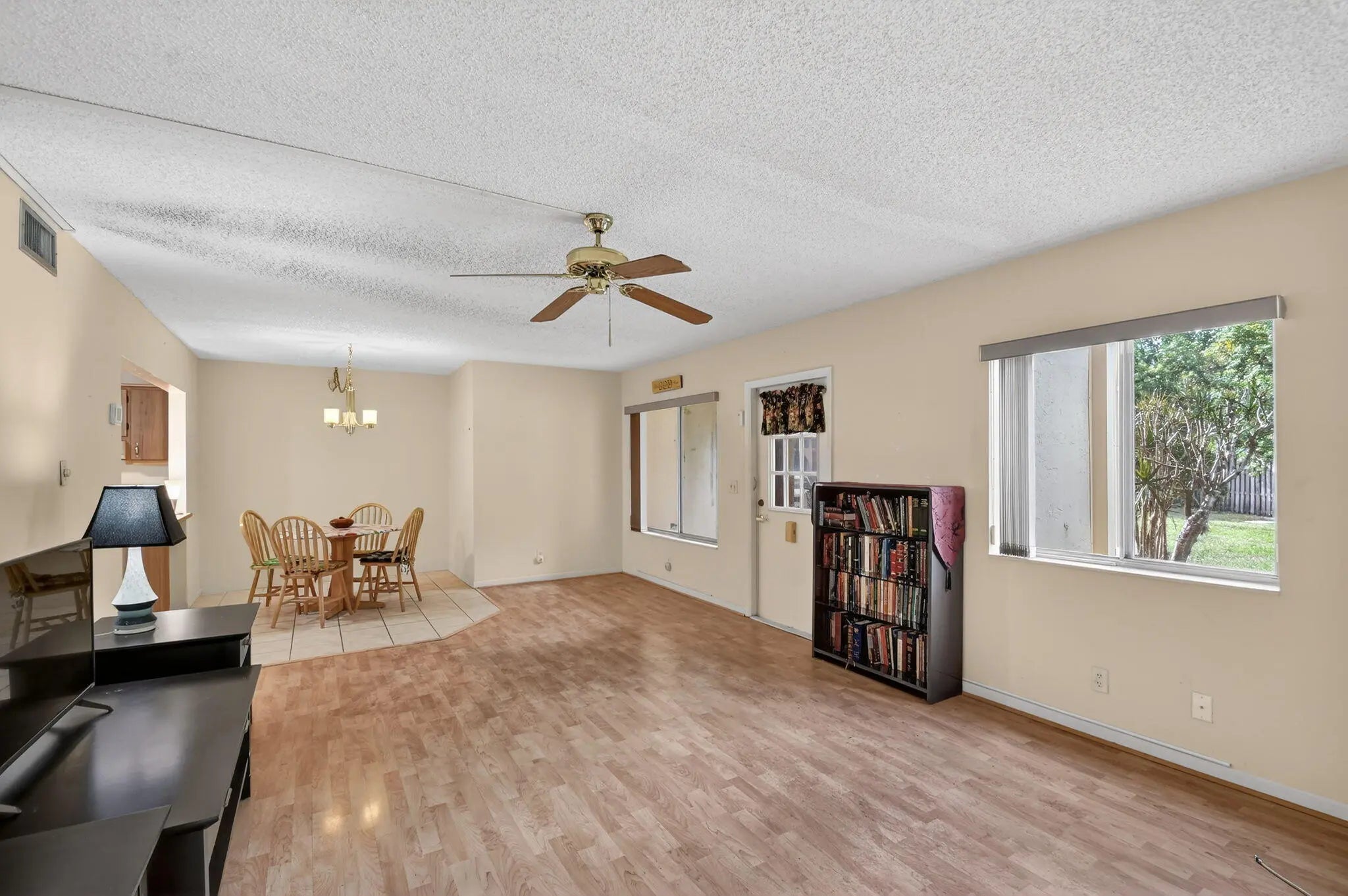 Step into this inviting first floor corner condo through the enclosed screen porch featuring 2 bedrooms and 1 bathroom with an open and comfortable layout. The kitchen flows seamlessly into the dining area and living room, creating a bright and connected space for everyday living. A convenient utility room off the kitchen houses the water and dryer, AC handler, and hot water heater and room enough for some storage. Laminate flooring adds warmth throughout the living areas, while tile flooring in the kitchen and dining area offers durability and easy maintenance. Enjoy the community lifestyle with a short walk to the pool, clubhouse, and tennis courts, giving you plenty of options for relaxation and recreation. Great location to many activities and approximately 10 miles to the beach.